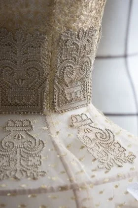 繁复的蕾丝与刺绣如浮雕般描绘往昔辉煌,