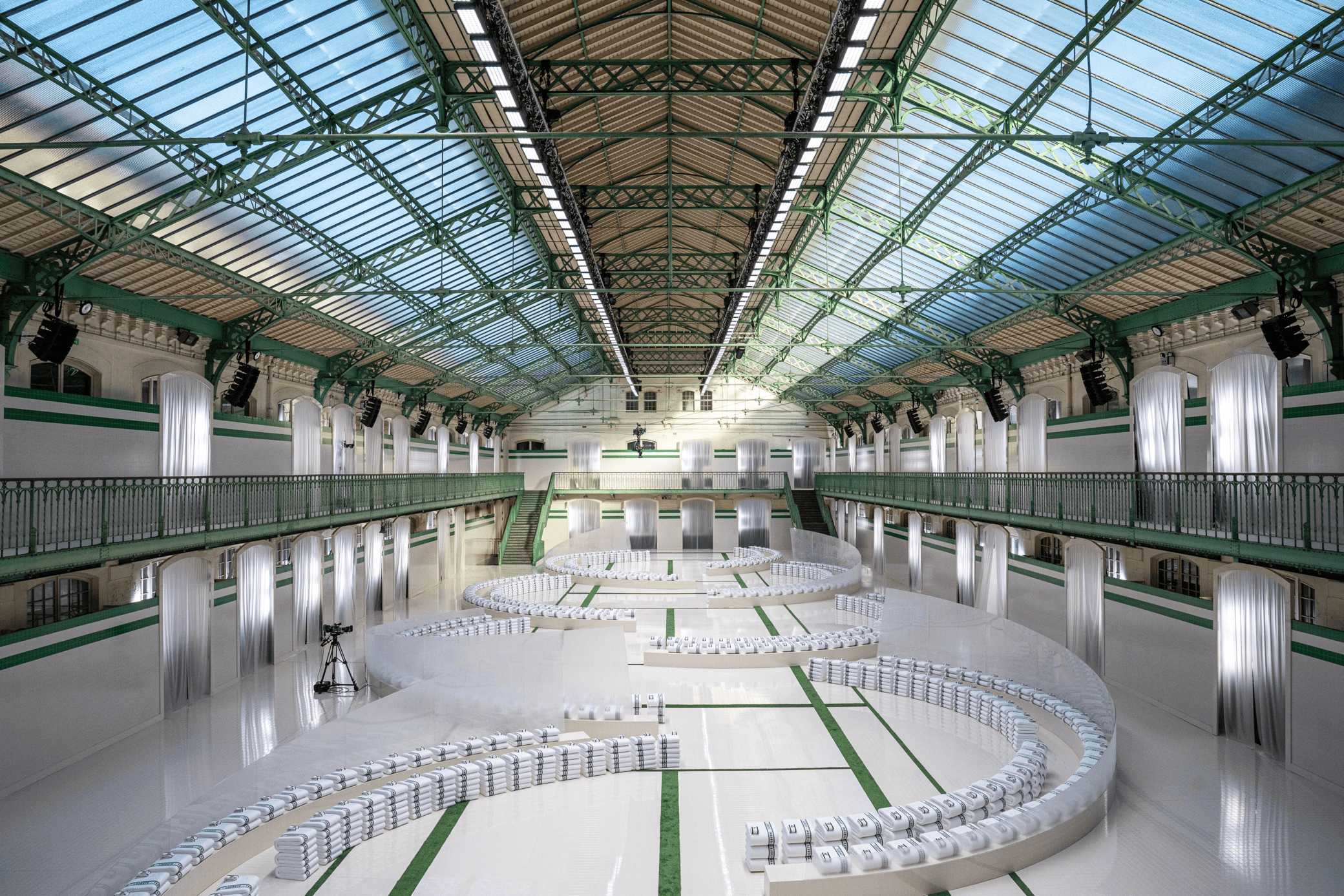 在巴黎卡诺中学(Lycée Carnot)埃菲尔大厅这一历史性地标,LACOSTE 将 2026 春夏巴黎时装秀的舞台重塑为「更衣室」。这座由设计师赫克托·德乔治(Hector Degeorge)于 1895 年打造的玻璃与钢铁建筑杰作,通过瓷砖铺陈的墙面重现了勒内·拉科斯特(René Lacoste)等网球明星、及所有运动员所熟悉的“后台”氛围,氤氲着水汽的弧形玻璃幕墙与层层垂落的淋浴帘幕,则营造出一种窥视感——让私密仪式与公共展演的界限悄然消融。