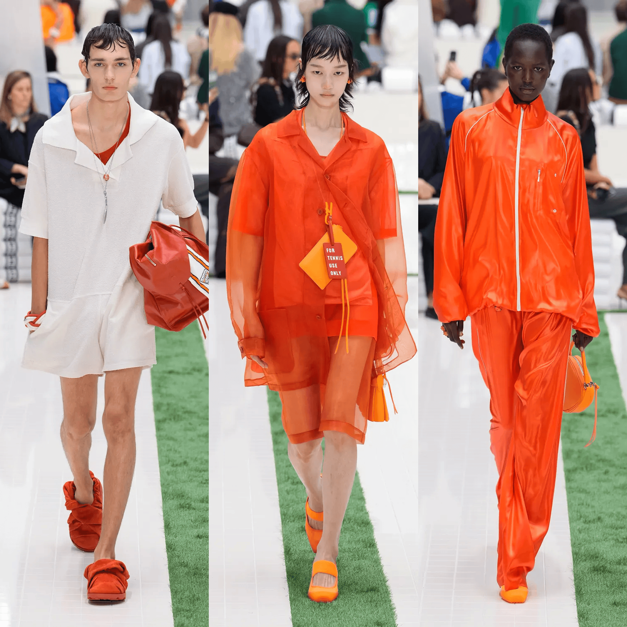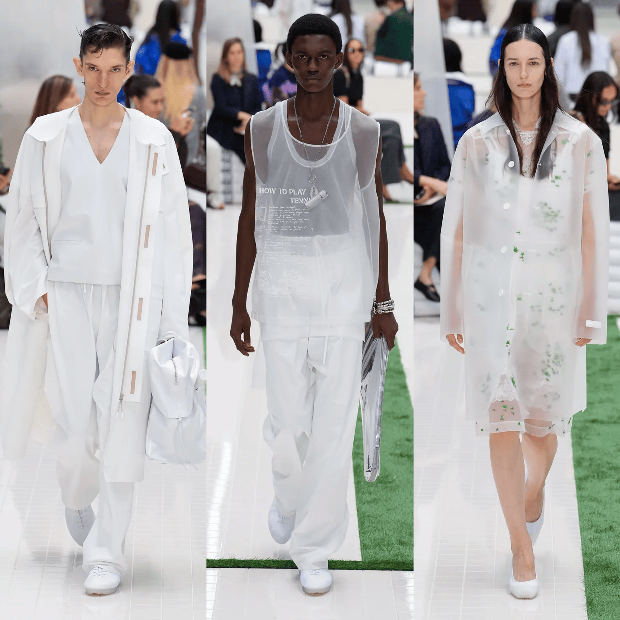 感性美学、未完成廓形与运动基因在复古运动风潮中交融,奠定整个系列优雅而富有动感的基调 —— 透视 Polo 衫、镜面皮革上的宣言、印有 “Tennis for Everyone” 的浴袍式风衣,以及与功能性橡胶棉、亮面尼龙形成材质张力的科技绸面单品。