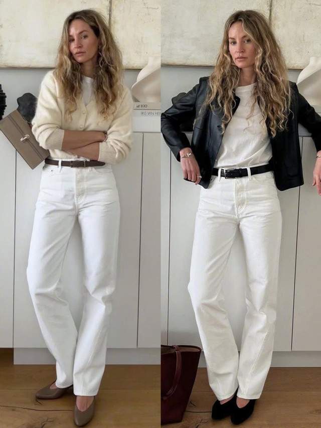 翻看 Anouk Yve 的 ins 主页,你会发现她的穿搭格外 “接地气”—— 没有动辄五位数的奢侈品堆砌,更多的是基础款单品的巧妙组合:利落的直筒牛仔裤、质感上乘的纯色针织衫、剪裁简约的西装外套、垂坠感极佳的衬衫裙…… 这些在衣柜里几乎人人都有的单品,经过她的搭配,却总能呈现出松弛又不失精致的氛围。比如她常穿的白色衬衫,不会刻意追求紧绷的版型,反而选择略带宽松的剪裁,搭配一条高腰阔腿裤,再用一条细腰带轻轻勾勒腰线,既解决了宽松单品显臃肿的问题,又营造出随性自在的法式慵懒感,通勤或约会穿都毫无违和感。