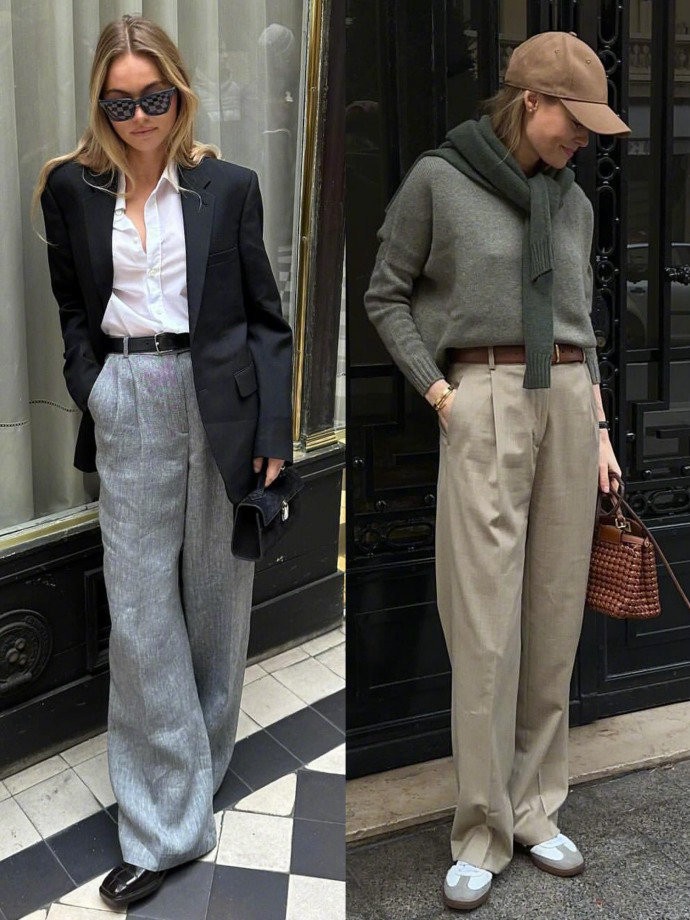 她对色彩的选择更是将极简美学贯彻到底,几乎很少出现超过三种颜色的搭配,大多以黑白灰、米白、浅卡其、深棕等低饱和色系为主。就像一套浅灰色的西装套装,内搭一件白色吊带,下装搭配同色系的九分西装裤,露出脚踝,再配上一双白色乐福鞋,整体色调统一和谐,没有一丝多余的色彩干扰,却凭借材质的差异 —— 西装的挺括与吊带的柔软形成对比,让造型层次感十足。这种低饱和色系的搭配不仅对各种肤色都十分友好,还能自然提升穿搭的质感,即使是平价单品,也能在她的演绎下穿出轻奢感。