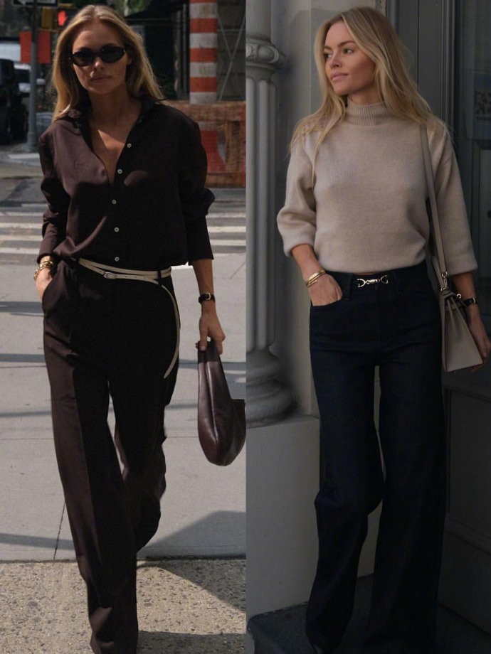 Claire Rose 的极简穿搭从不意味着单调乏味,反而藏着许多 “小心机”。她擅长利用单品的版型差异打造层次感,比如用一件宽松的米色针织开衫,内搭一件修身的黑色打底衫,下装搭配一条黑色紧身牛仔裤,宽松与紧身的碰撞,既避免了整体造型的臃肿,又凸显出身材曲线;她也懂得用材质的对比增添细节感,比如丝绸材质的衬衫搭配棉质的阔腿裤,丝绸的光泽感与棉质的哑光感相互映衬,让简约的造型多了几分精致;偶尔,她还会用一件带有细微设计感的单品打破沉闷,比如在全黑的造型中加入一条带有金属扣的黑色皮带,或是选择一件袖口带有小开叉设计的白衬衫,这些细微的设计不张扬,却能让整体造型更有记忆点。