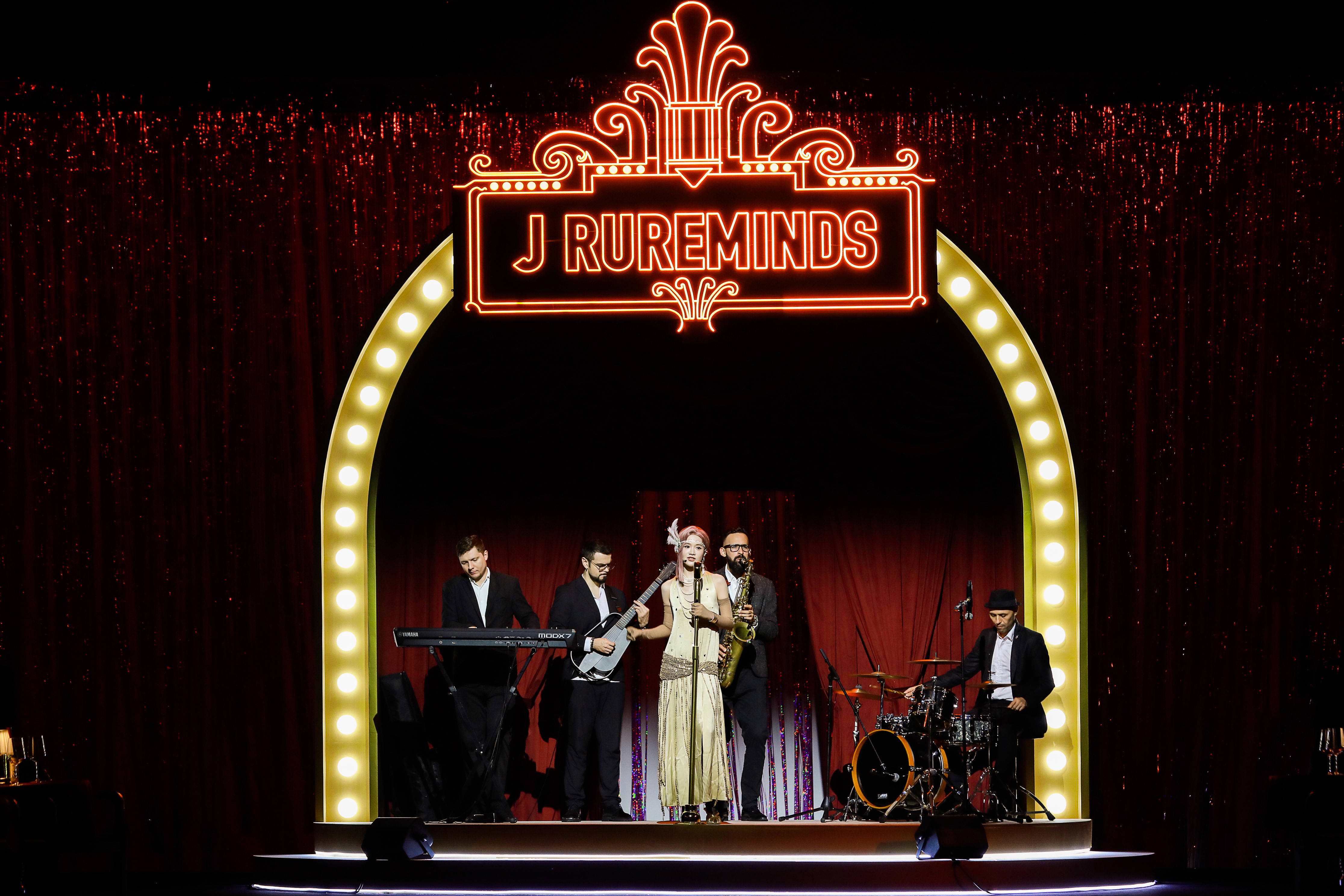 J RUREMINDS 本次的春夏系列将秀场搬到了1920年代的爵士舞台,在暖调泛黄的镭射灯下,红丝绒帷幕缓缓升起,人们在举杯推盏间,回到那个让人沉醉、遐想的黄金时代。00后音乐人司南用一首爵士乐作为开场,让观众沉浸式进入到此次大秀中。热情洋溢的萨克斯,伴随洒脱跳跃的鼓点,模特游离于复古与现实的边界,穿梭在璀璨金色的舞台与聚光灯下,让人沉浸属于1920s的熠熠生辉。