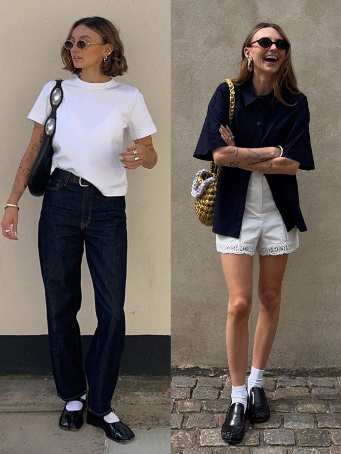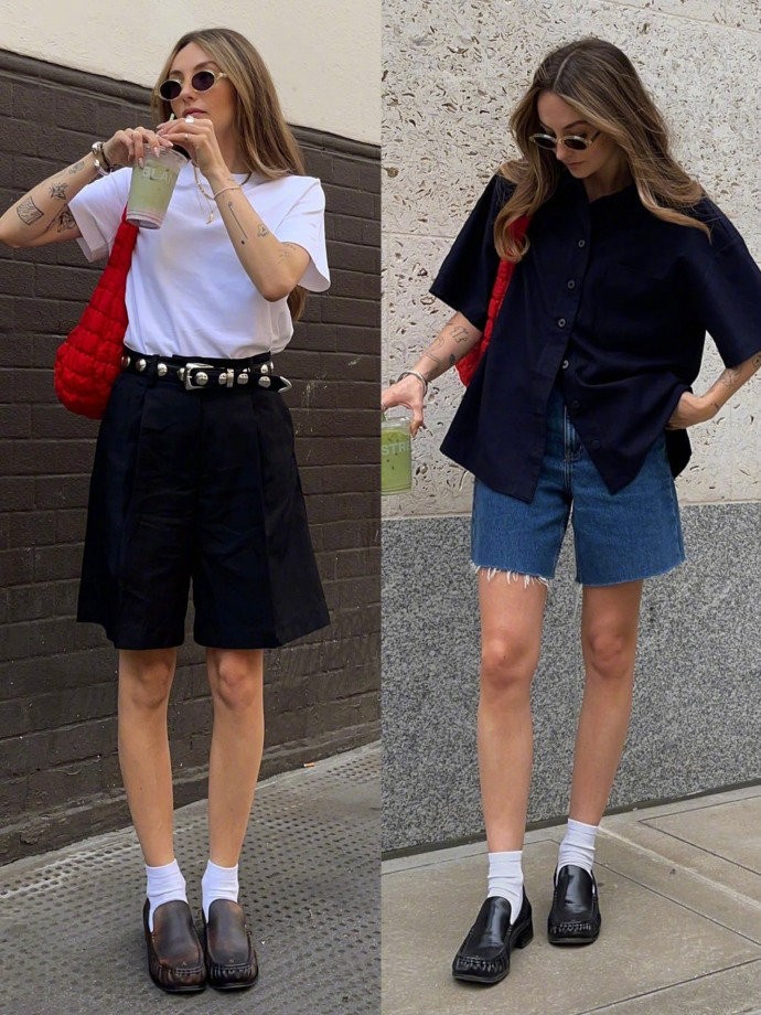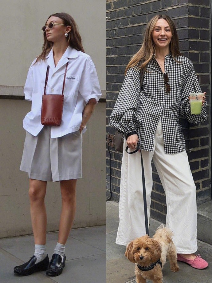 在比例优化上,Chloe Hayward 的技巧简单又好操作,156 小个子跟着学几乎不会出错。她最常用的是 “上短下长 + 同色系延伸” 的组合,比如浅棕色短款针织开衫内搭白色短 T 恤,下身搭配深棕色高腰直筒裤,脚上穿一双同色系的短靴,整套造型用同色系串联,没有明显的色彩分割,再加上 “上短下长” 的版型搭配,视觉上能让腿长至少显长 5 厘米;面对容易显臃肿的宽松单品时,她会用 “细腰带 + 露脚踝” 的方式来调整,比如穿宽松的长款衬衫时,在腰间系一条细巧的皮质腰带,轻轻勒出腰线,再搭配短裤打造 “下衣失踪” 的效果,脚下穿一双浅口单鞋露出脚踝,既保留了衬衫的慵懒感,又不会让宽松的版型显得拖沓;她还很擅长用 “鞋款延伸腿部线条”,156 身高的她很少穿笨重的厚底鞋,反而偏爱裸色浅口单鞋、黑色细跟短靴,这些鞋款要么能和肤色衔接,要么能露出脚踝,从视觉上延长腿部线条,让整体比例更协调。