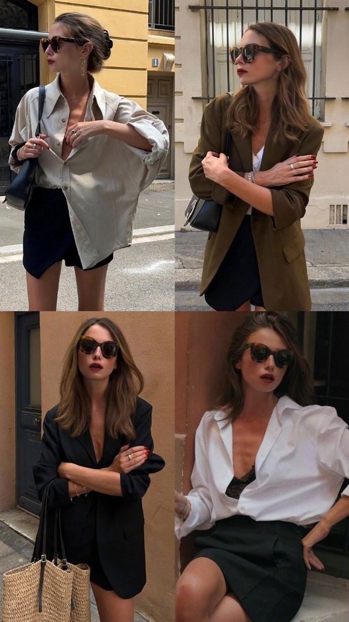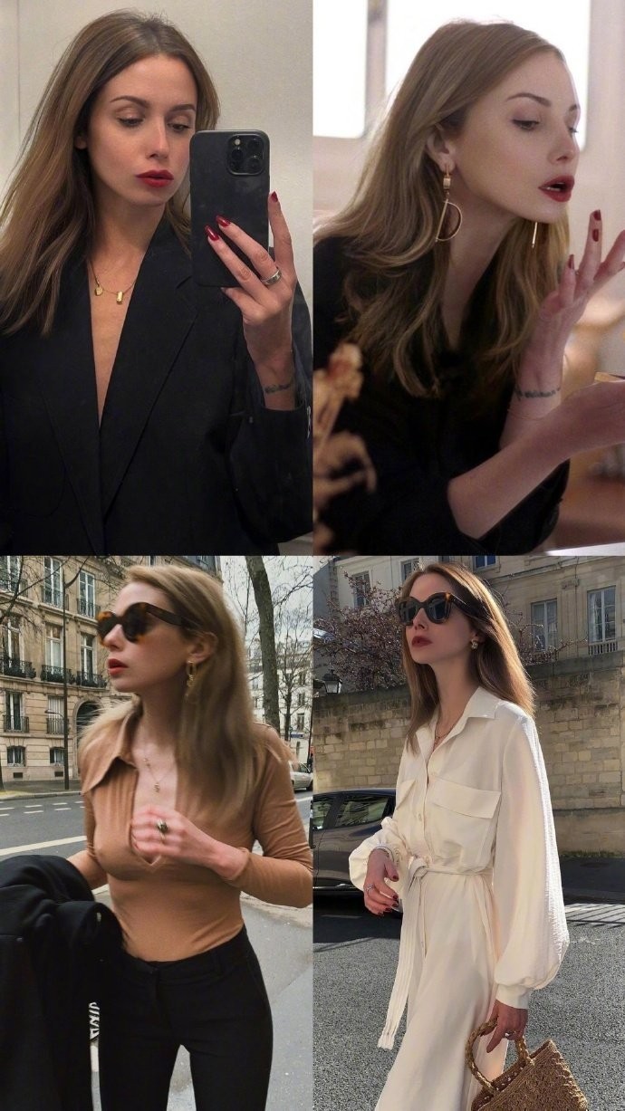 她对色彩的选择也始终贴合法式风格的精髓,不追求浓烈的撞色,而是偏爱低饱和度的柔和色调,或是经典的中性色系,却能通过色彩的微妙呼应,让整体造型显得和谐又有层次。比如一套以淡粉色为主的穿搭,淡粉色的宽松衬衫搭配同色系的高腰阔腿裤,脚上踩一双米白色的穆勒鞋,手上拎着一只浅棕色的藤编包,柔和的粉色与温暖的大地色相互映衬,既保留了女性的柔美,又不会显得甜腻;而经典的黑白配在她身上也有了新的演绎,黑色的短款皮衣内搭一件白色的真丝吊带,下装是一条黑色的直筒牛仔裤,脚踩一双白色的运动鞋,刚柔并济间,既有酷飒的洒脱,又不失法式的精致。