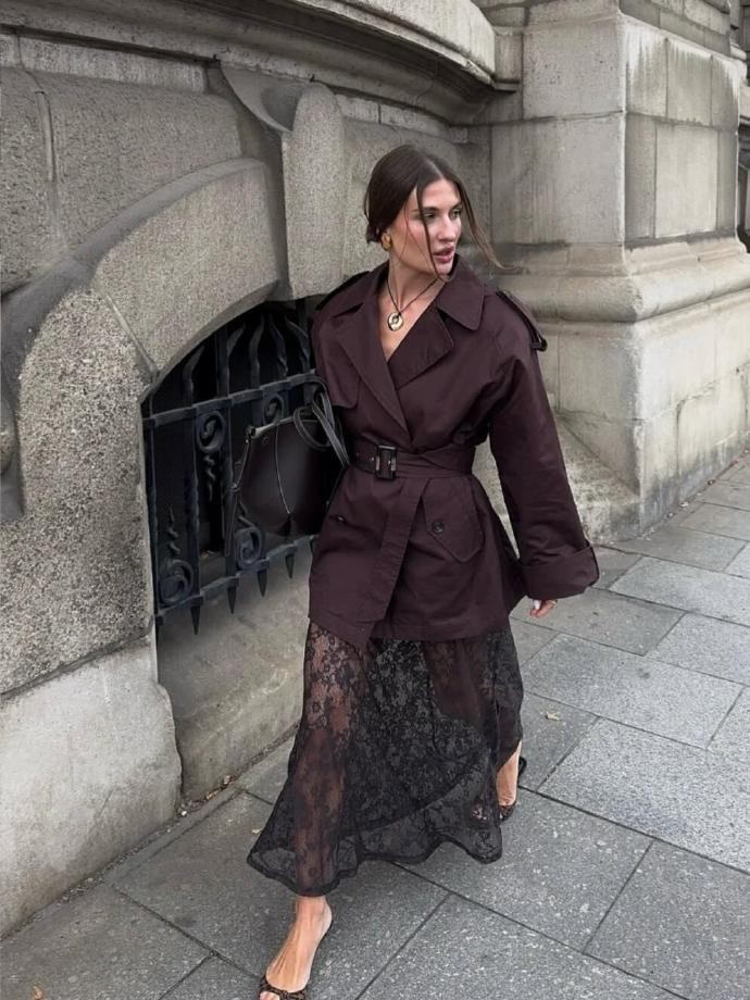 alena_dedarde的秋冬穿搭最让人眼前一亮的,是她对“层次感”的精妙运用。她从不满足于简单的单品叠加,而是通过不同材质、版型的服饰组合,营造出丰富又不杂乱的视觉效果。比如一件浅灰色的薄款针织开衫,她会内搭一件白色的蕾丝打底衫,下装搭配一条焦糖色的灯芯绒阔腿裤,脚上踩一双黑色的短靴。针织开衫的软糯、蕾丝的细腻与灯芯绒的复古相互碰撞,不仅在质感上层次分明,色彩搭配也温暖和谐,既符合秋冬的氛围,又尽显温柔气质。再比如在寒冷的冬日,她会将一件长款的驼色羊绒大衣披在肩上,内搭一件黑色的高领毛衣和一条格纹半身裙,手里拎一个棕色的皮质手提包,整体造型既有大衣的大气,又有格纹的复古细节,层次感十足的同时又不失高级感。