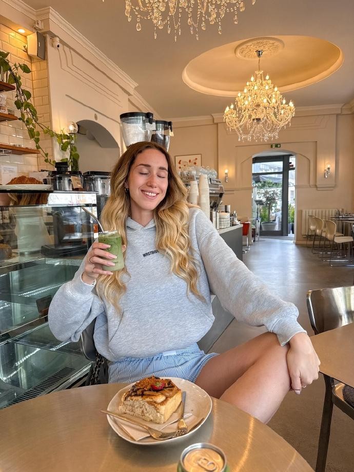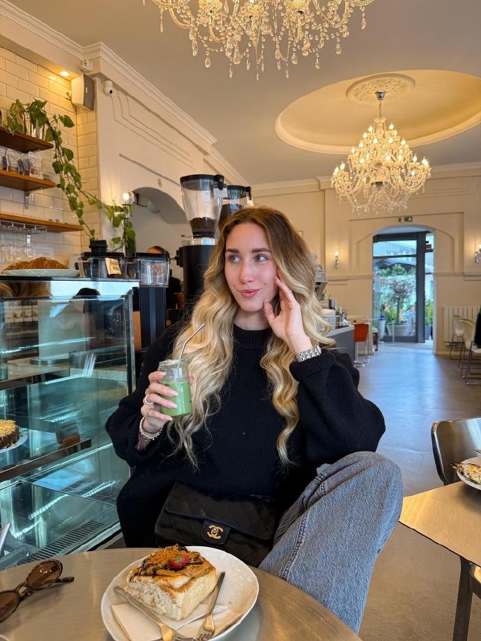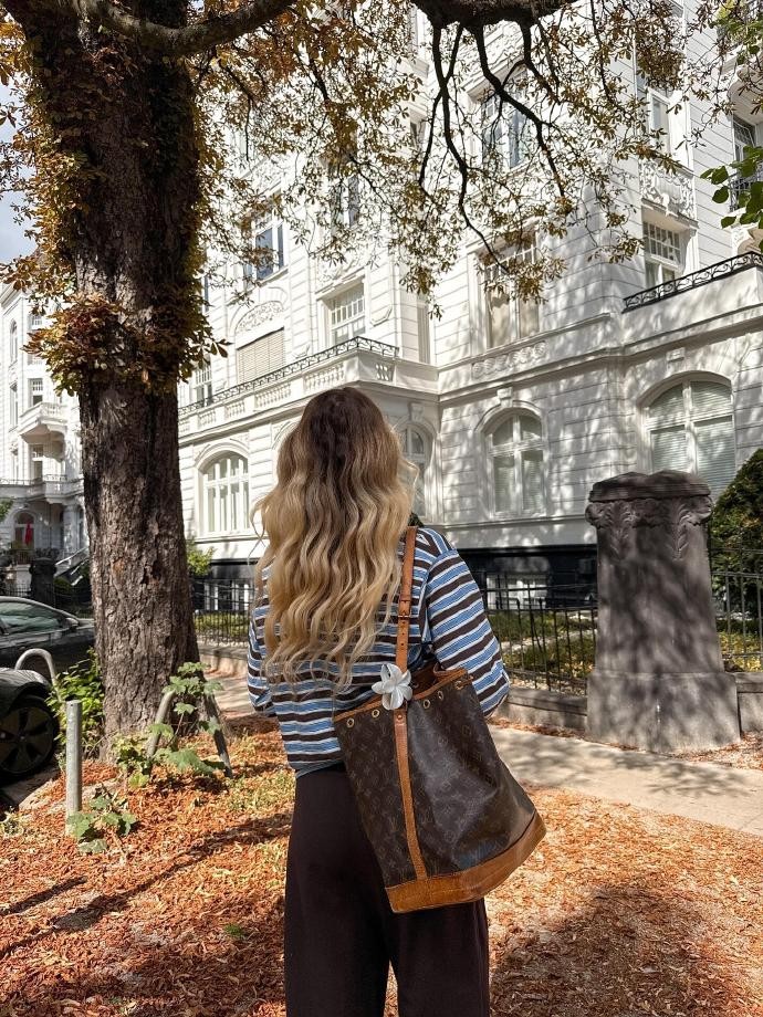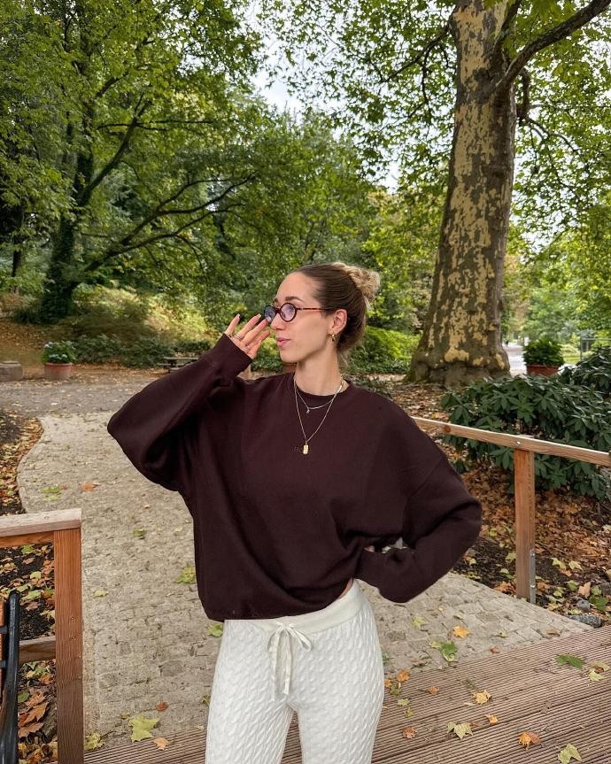 在色彩上,Celinekmn 格外偏爱 “低饱和大地色”。不是浓烈的焦糖或深沉的墨绿,而是像奶茶棕、燕麦色、浅卡其、柔雾灰这类温柔的色调,单穿显气质,叠穿也不会杂乱。她曾分享过一套经典搭配:浅燕麦色的高领打底,外搭一件奶茶棕的短款针织开衫,再套一件浅卡其色的长款风衣,三个颜色同属大地色系,却有深浅过渡,视觉上格外和谐;下装是一条烟灰色的灯芯绒半身裙,长度到小腿中部,走路时裙摆轻轻摆动,配上一双米色的短靴,整个造型没有一处用力的设计,却把秋日的温柔拿捏得恰到好处。就连配饰,她也坚持 “少而精”—— 一条细巧的银色锁骨链、一只米色的皮质托特包、一顶浅棕色的针织贝雷帽,都是小而精致的存在,悄悄提升整体造型的完整度,却从不过分抢镜。