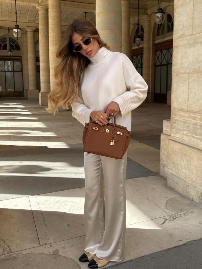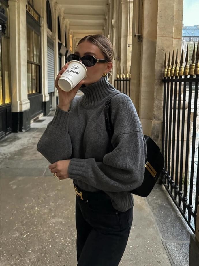 色彩搭配是marielouduvillier穿搭中另一个值得关注的点。她偏爱低饱和度的莫兰迪色系和经典的中性色,如米色、燕麦色、灰色、黑色等,这些颜色不仅容易搭配,还能营造出温柔、高级的氛围。偶尔她也会加入一些亮色作为点缀,比如一件酒红色的针织衫、一条姜黄色的半身裙,或者一双宝蓝色的鞋子,但这些亮色从不喧宾夺主,而是与整体的低调色系相互映衬,让造型更加生动有趣。例如她曾晒出的一套造型,上身是燕麦色的高领毛衣,下身搭配深灰色的半身长裙,脚上穿着一双酒红色的短靴,手提一个黑色的小皮包,整体色彩和谐统一,又因为酒红色短靴的加入而多了一丝亮点,让人眼前一亮。这种色彩搭配技巧,既避免了大面积亮色带来的浮夸感,又能让穿搭不显得单调乏味,非常适合日常穿着。
