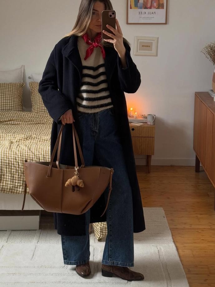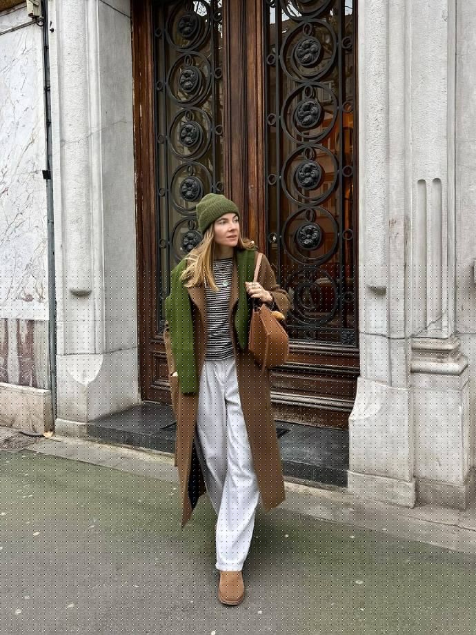 aga_bdk的秋冬过渡穿搭,在色彩选择上极具法式特色,偏爱低饱和的中性色与大地色系。驼色、燕麦色、深棕、牛仔蓝是她造型中的高频色彩,这些颜色不仅适配秋冬的温暖氛围,搭配起来也毫无难度,轻松就能打造出高级感。她擅长用同色系叠穿构建层次,比如一件燕麦色宽松毛衣内搭浅棕色高领针织衫,下身搭配深棕色直筒裤,色彩过渡自然柔和,既保暖又不会显得臃肿。偶尔也会加入少量低饱和亮色作为点缀,比如香芋紫围巾或浅粉色针织帽,瞬间让沉闷的中性色造型焕发生机。