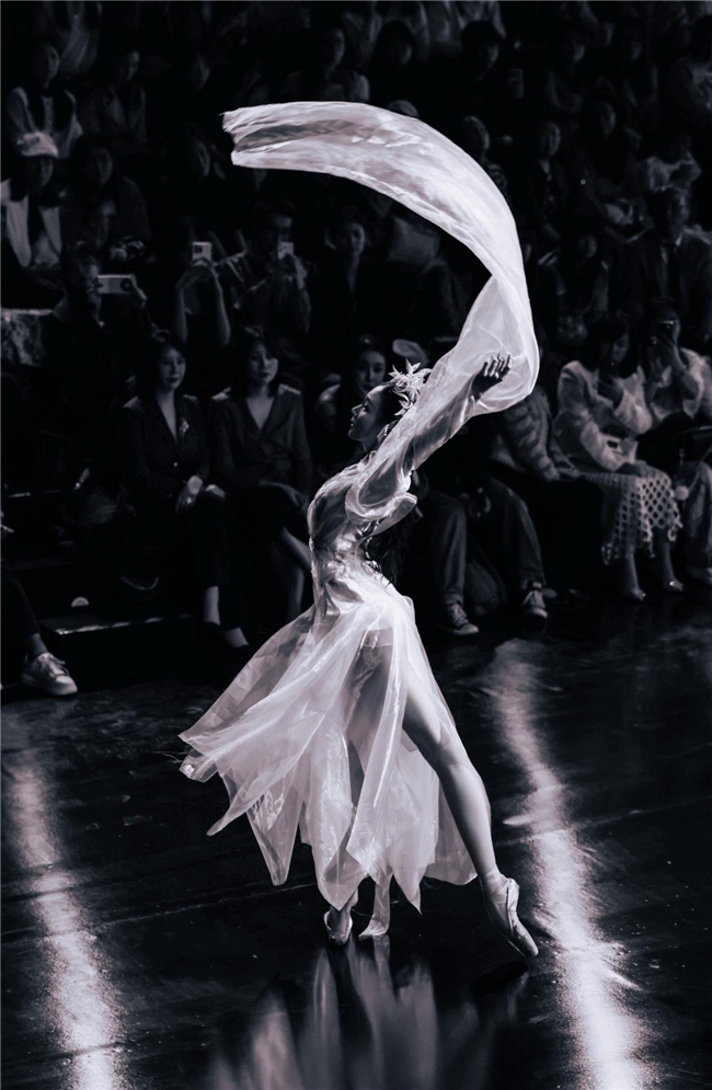 第二幕「兰」由一段唯美克制的芭蕾在光影中轻盈旋转,著名芭蕾舞蹈家邱思婷极致诠释何谓遗世独立的中式清雅。
