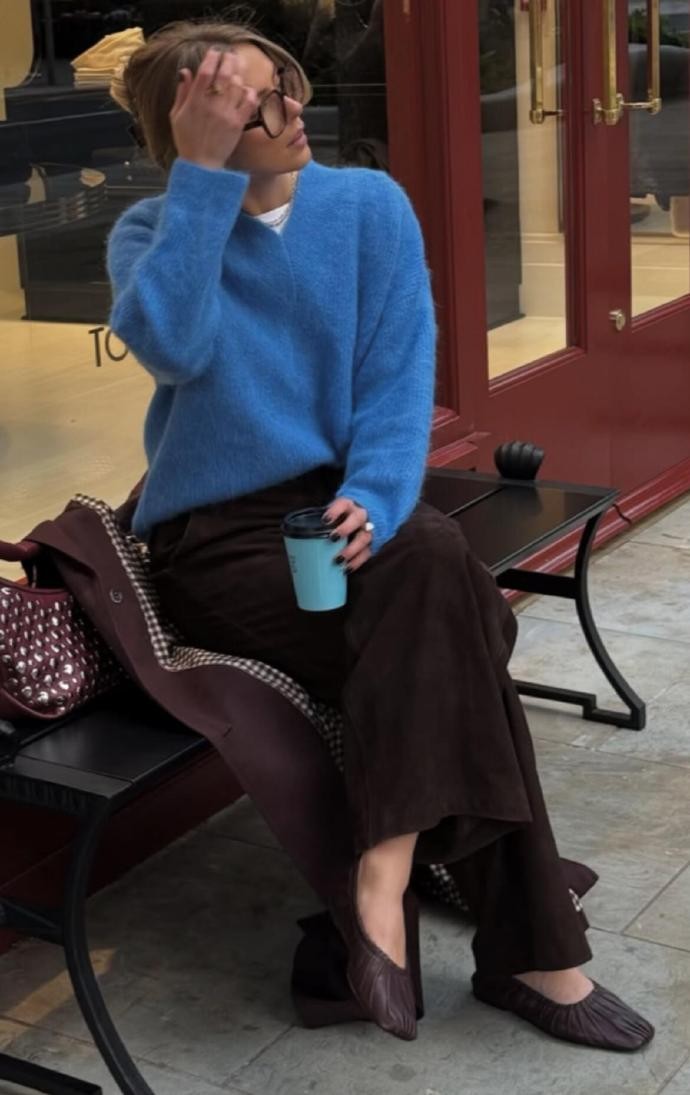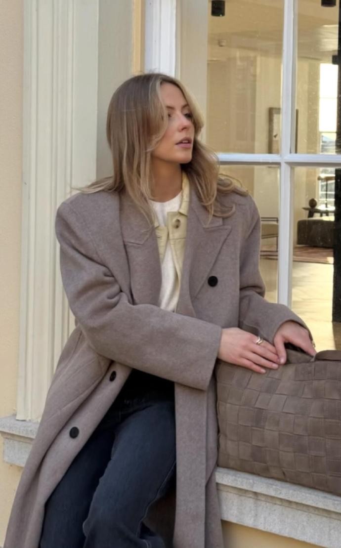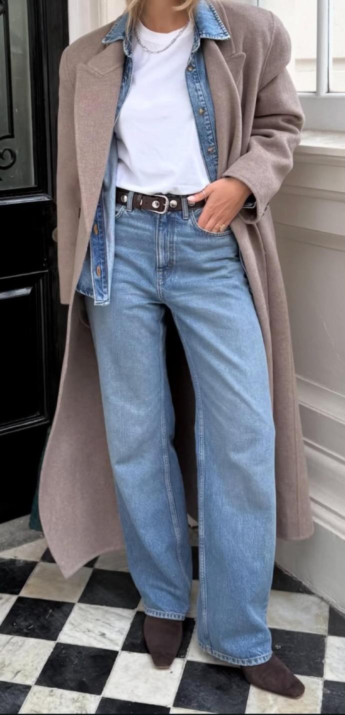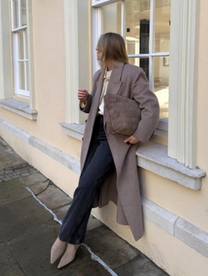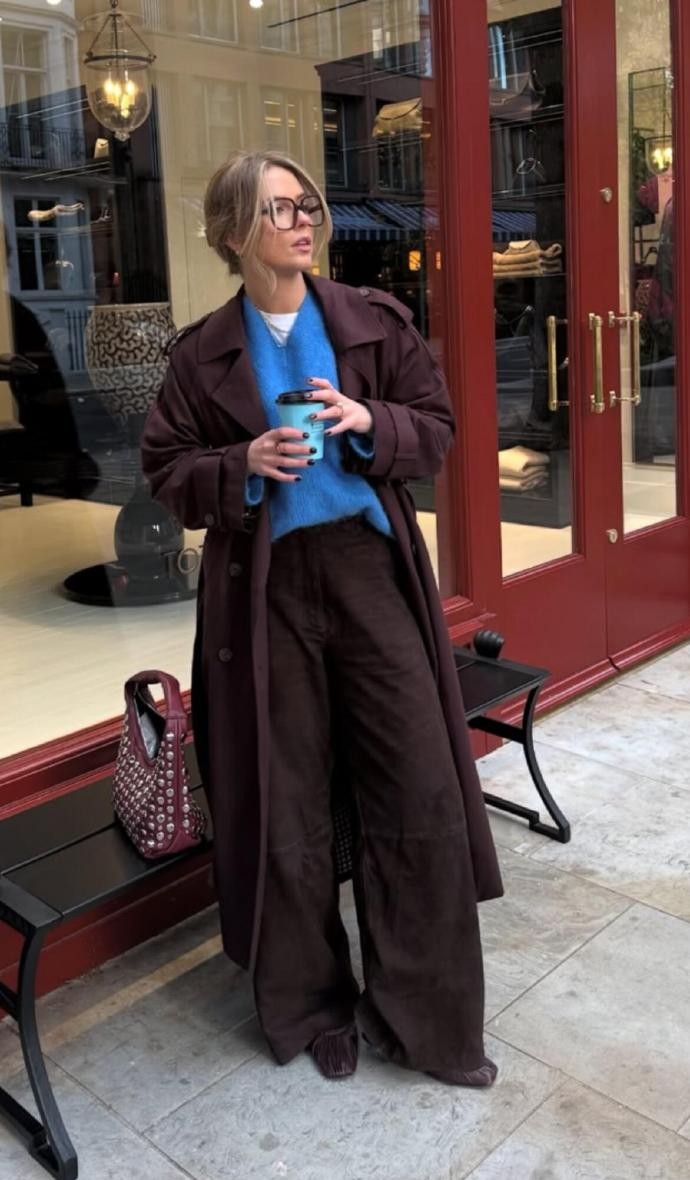 她对材质的运用也十分考究,呢料大衣的挺括、牛仔的休闲、针织的柔软,在她的搭配里总能和谐共生。比如深棕大衣搭配同色系阔腿裤,内搭亮蓝色针织衫,冷暖色调的碰撞既打破了沉闷,又让整体造型充满活力;而燕麦色大衣叠穿牛仔外套,再配上浅蓝牛仔裤,则用不同质感的牛仔单品,打造出随性又复古的街头感。