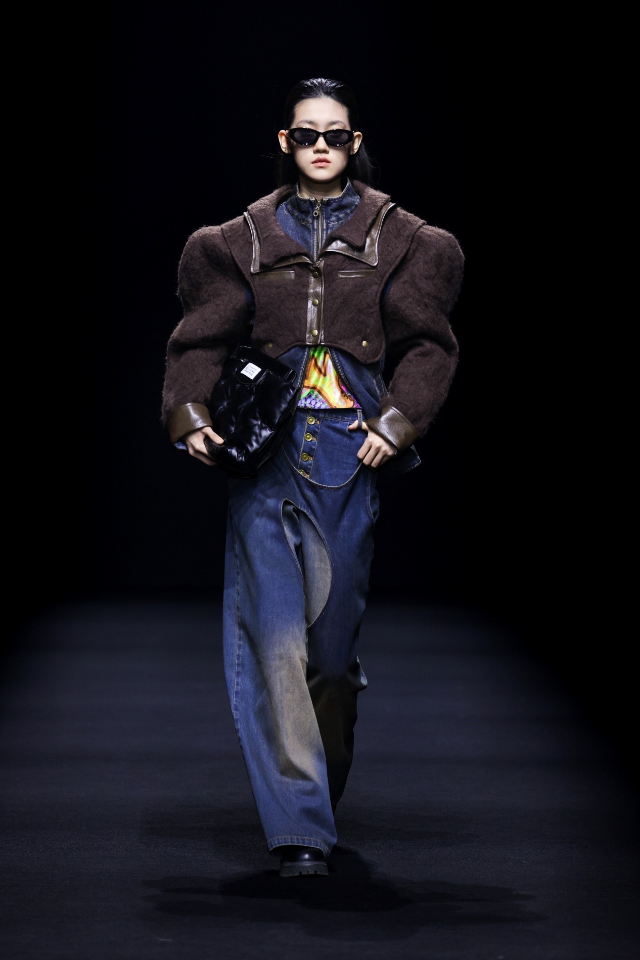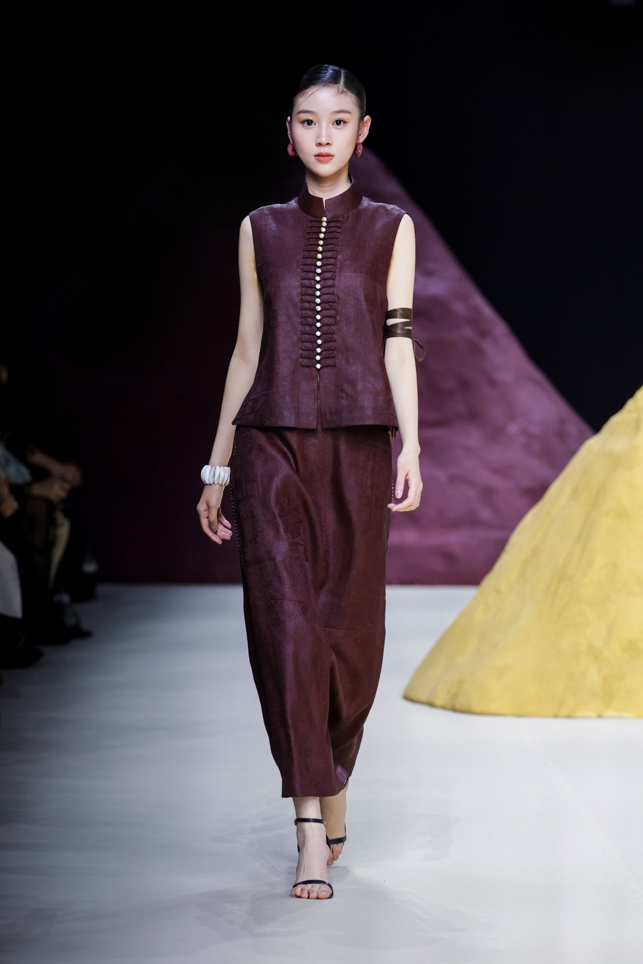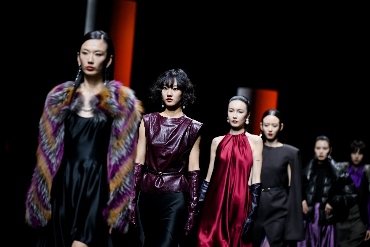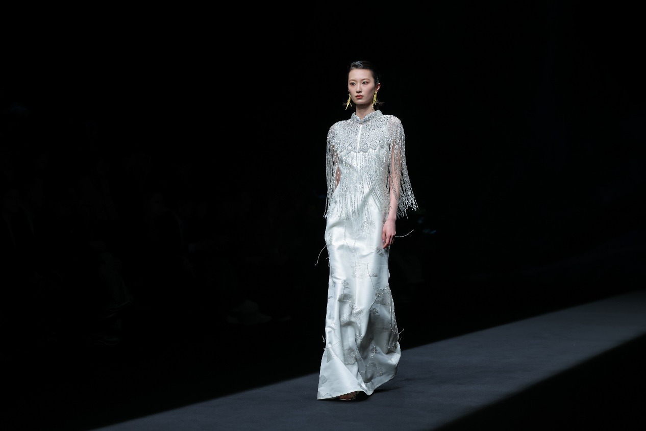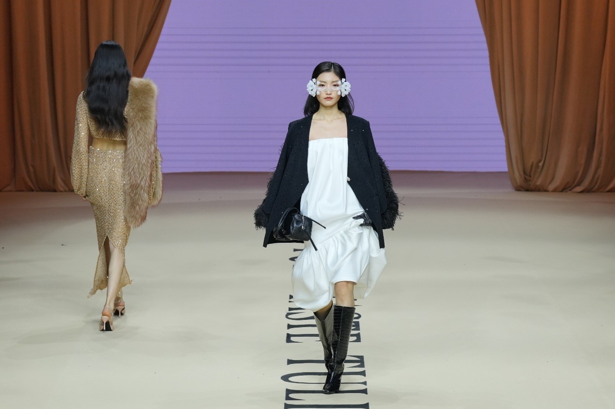 Y2FREEDOM品牌设计师胡莹莹以高端皮草面料设计,通过松弛廓形搭配利落剪裁,兼顾穿着温度与身心舒适,为高知女性打造兼具艺术感与实穿性的先锋着装;嘉兴南湖学院时尚设计学院带来产教融合师生作品发布会“界·境”,师生共创,打破皮革、皮草、织锦的技艺界限。熙颜XIYAN品牌设计师周雨君以“云和泥”演绎东方美学,将香云纱非遗工艺化作时尚华服;来自海宁市许村镇的设计师贺荣以“驰光”为主题,将传统织锦与现代设计创新融合,带去多款融入马元素的马面裙作品,让千年织锦在当代T台上焕发新生。郁香菲品牌主理人王佳华专注知性女性赛道,打造了具有文化温度与风格高度的现代女装新样板。