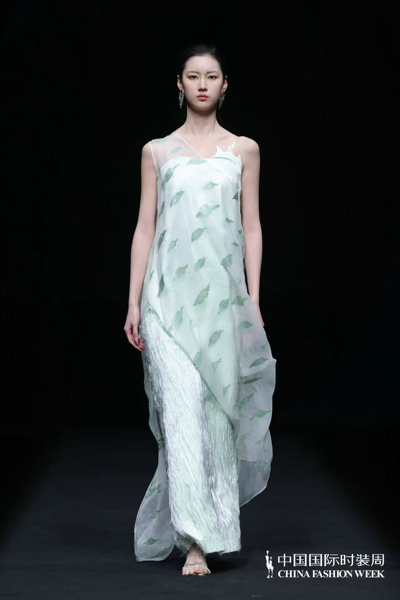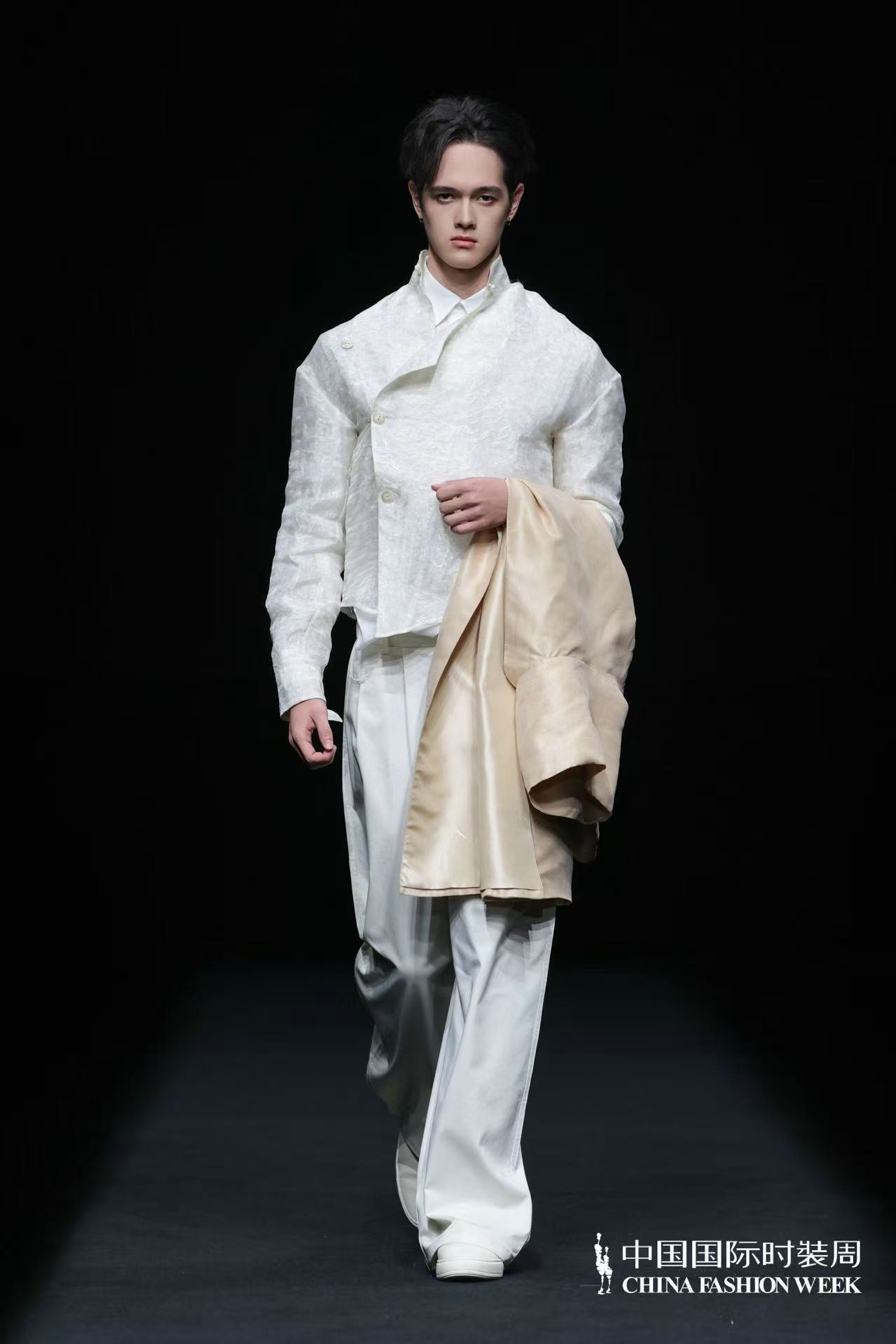 “天人合一”的理念贯穿系列设计始终,设计师贺荣摒弃传统纹样的原始堆砌,以留白式疏朗构图与满铺式肌理层次营造丰富视觉层次,将传统元素化作局部应用的巧思与细节装饰的精妙,在服装设计的“皮肤装饰”处做足文章,让东方意境融于现代审美。色彩上以自然色调为基底,从浅绿、浅蓝、米咖的清新雅致缓缓过渡至咖黑的沉稳大气,经典黑白、蓝绿及紫色系交织其间,如自然万象的光影流转,让穿着者在感受自然之美的同时,体悟人生的豁达与从容,实现视觉与心灵的双重滋养。