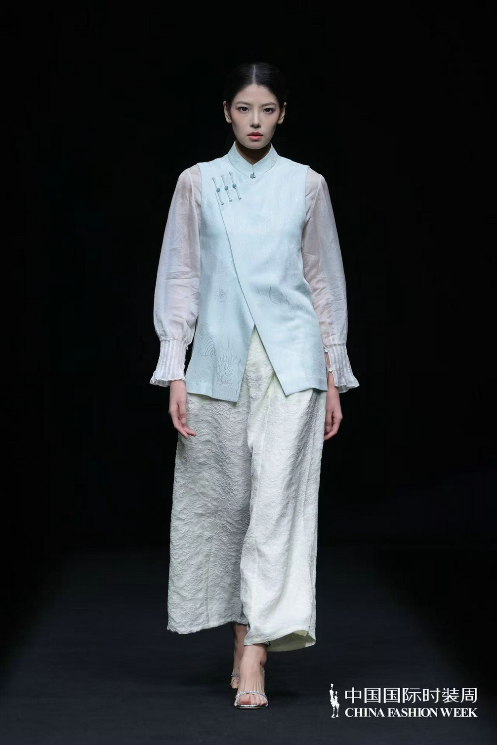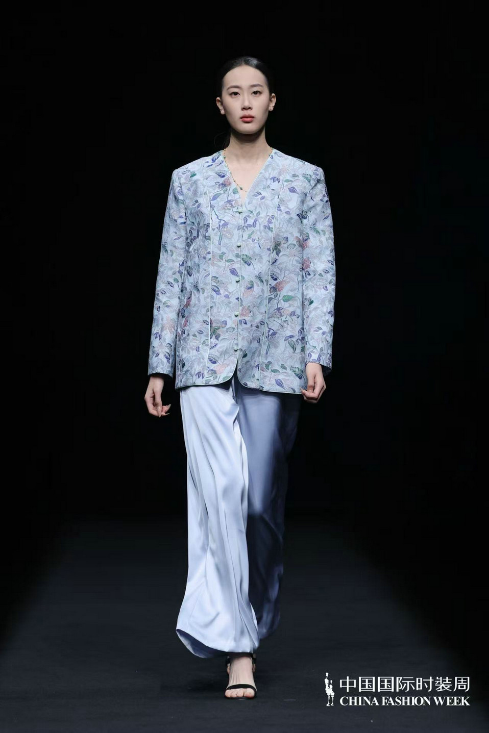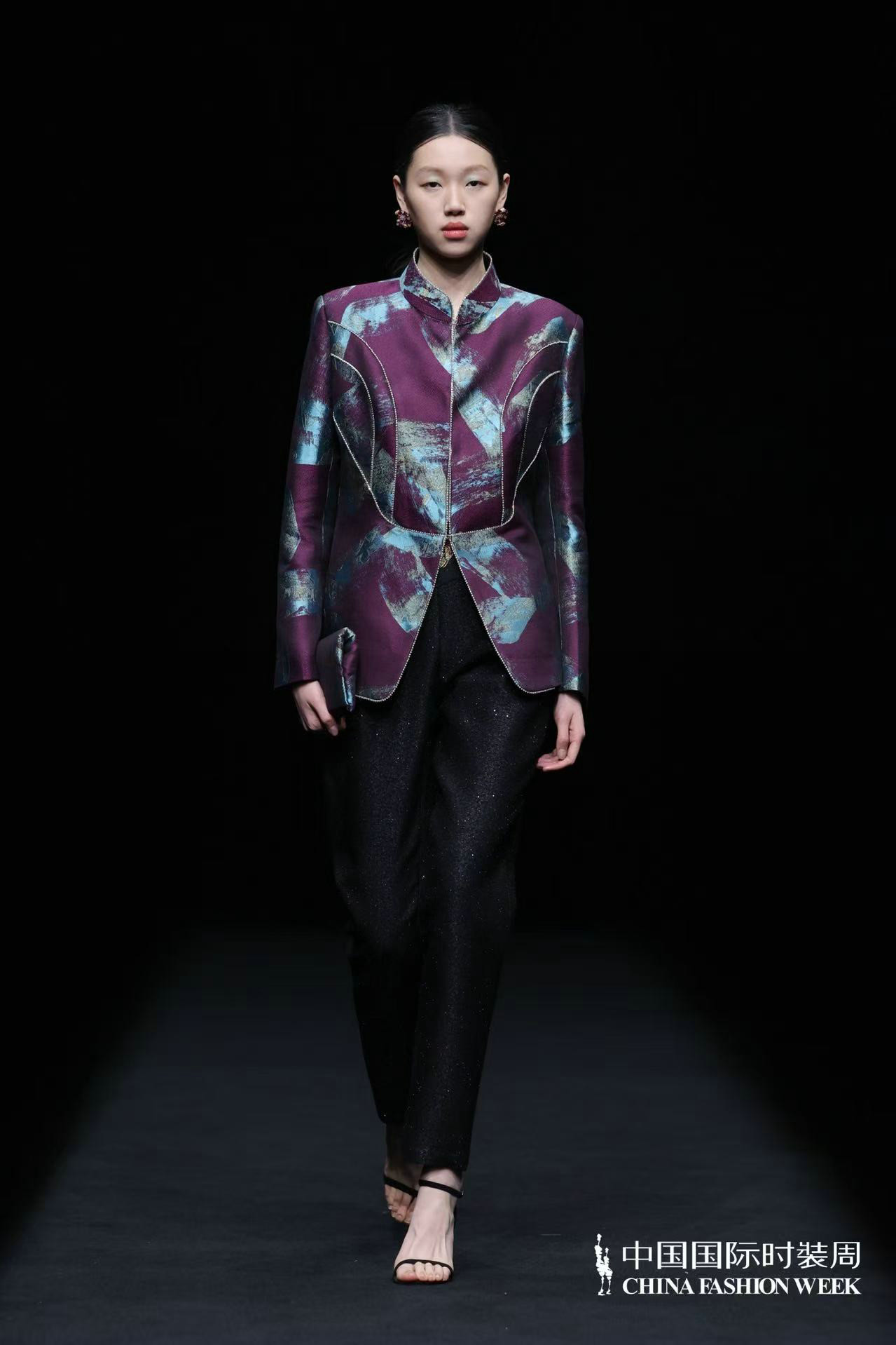 服装款式亦藏巧思,或飘逸灵动,似山间云雾缭绕;或精致细腻,如林间繁花绽放。中式经典美学元素与西装、马甲、短外套等西式廓形大胆碰撞解构,打破时空边界;不同质感的面料巧妙搭配,消解了传统服饰的厚重感,让东方雅致以更具当代感的姿态融入日常,完成传统文化的时尚化迭代与精神延续。