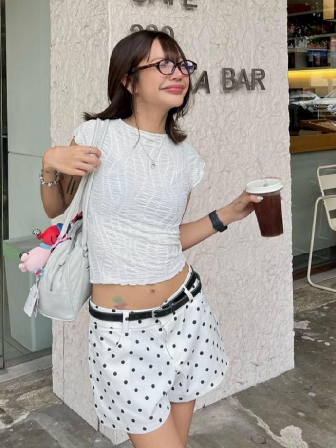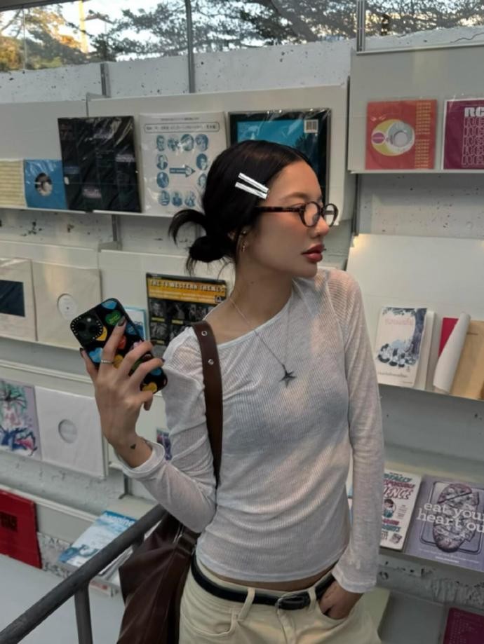 色彩搭配上,freaking.hungryy 偏爱低饱和度的极简色系,灰色、白色、牛仔蓝、黑色构成了她穿搭的主色调,偶尔加入波点、格纹等经典元素点缀,既不打破整体的和谐感,又能增添细节趣味。她尤其擅长灰色系的层次搭配,浅灰针织开衫内搭深灰紧身背心,或是灰色连帽卫衣叠穿蕾丝打底,同色系的深浅碰撞,让简约的造型瞬间拥有丰富的视觉层次。配饰在她的穿搭中更是点睛之笔,黑色细框眼镜自带文艺氛围感,金属发夹、简约项链和大容量托特包,每一件配饰都恰到好处,既提升了造型的完整度,又不会抢走服装本身的风头。