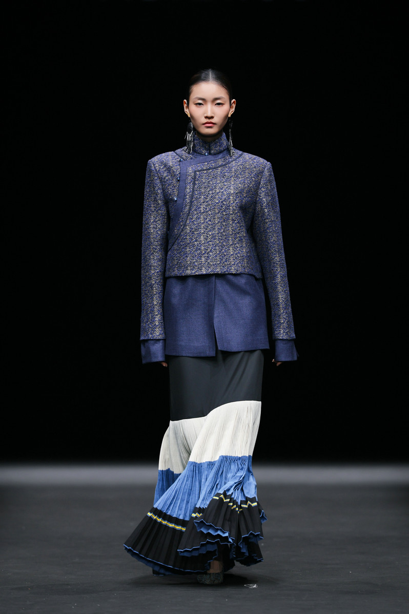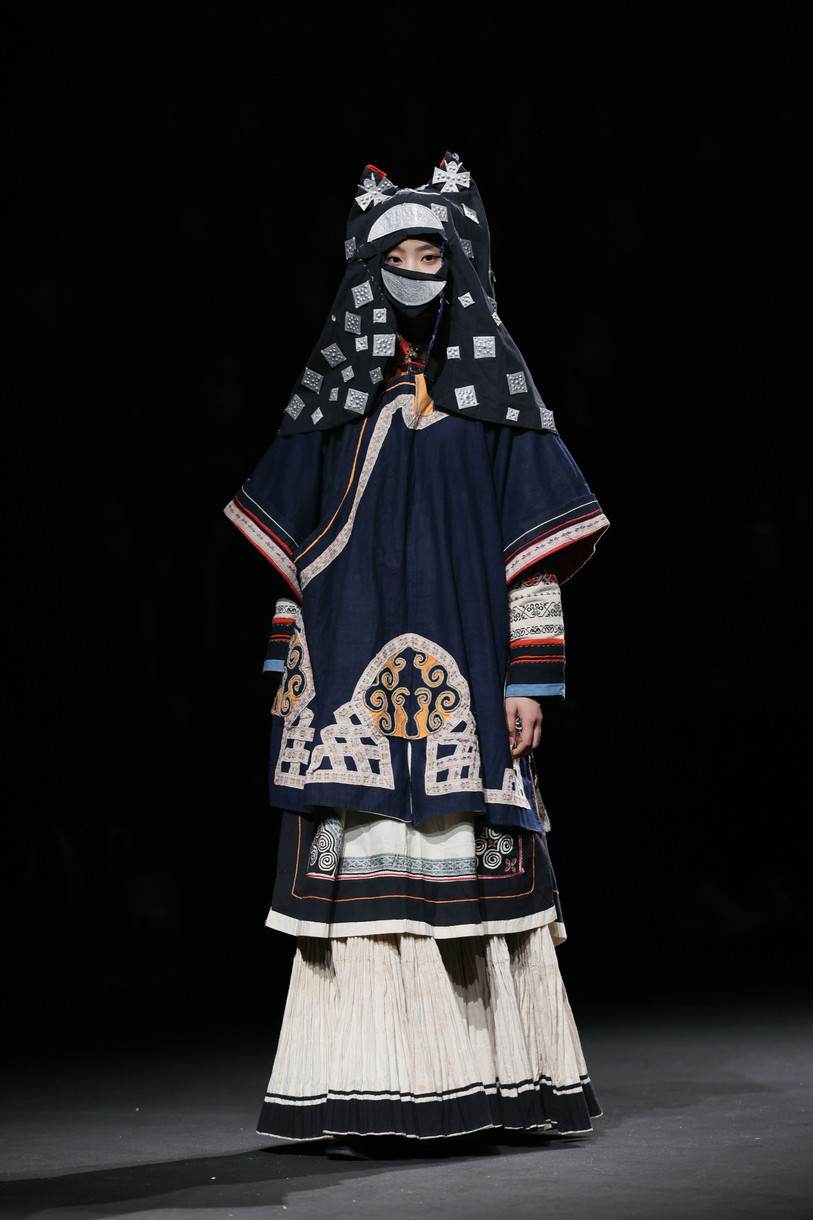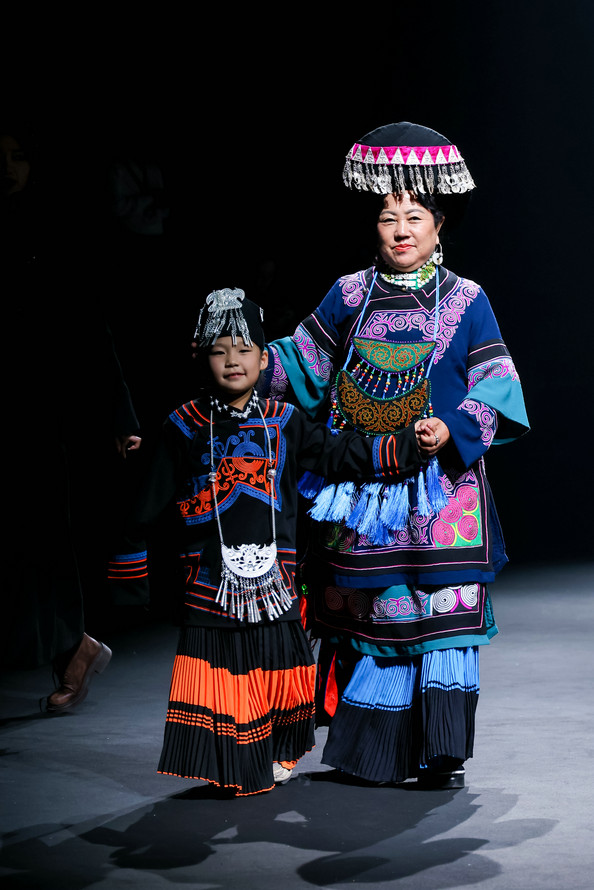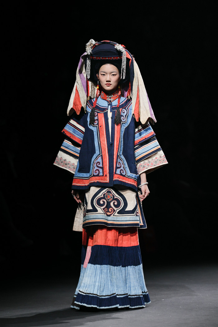 开篇“源启”极具震撼,随着“毕摩”非遗传承人以低沉雄厚的声音吟诵着对山河无恙、生活美好的祈愿,大秀缓缓拉开序幕。北京电影学院的17位舞者在女孩的百褶裙旋转飞扬,男孩的查尔瓦斗篷翻动跳跃中,再现了彝族人民劳作、节庆、嫁娶的生活场景;随后,国家级非遗传承人贾巴子则带领彝绣、银饰、音乐等国家级、州级非遗传承人和北京服装学院、北京电影学院的表演团队共同演绎了从上世纪初到当下的共约30套传统服装,复现了彝人于山河间的生活图景。“源启”以山河为序,唤醒彝人于山河间生生不息的文明图景,让千年衣脉,自大地深处缓缓归序。