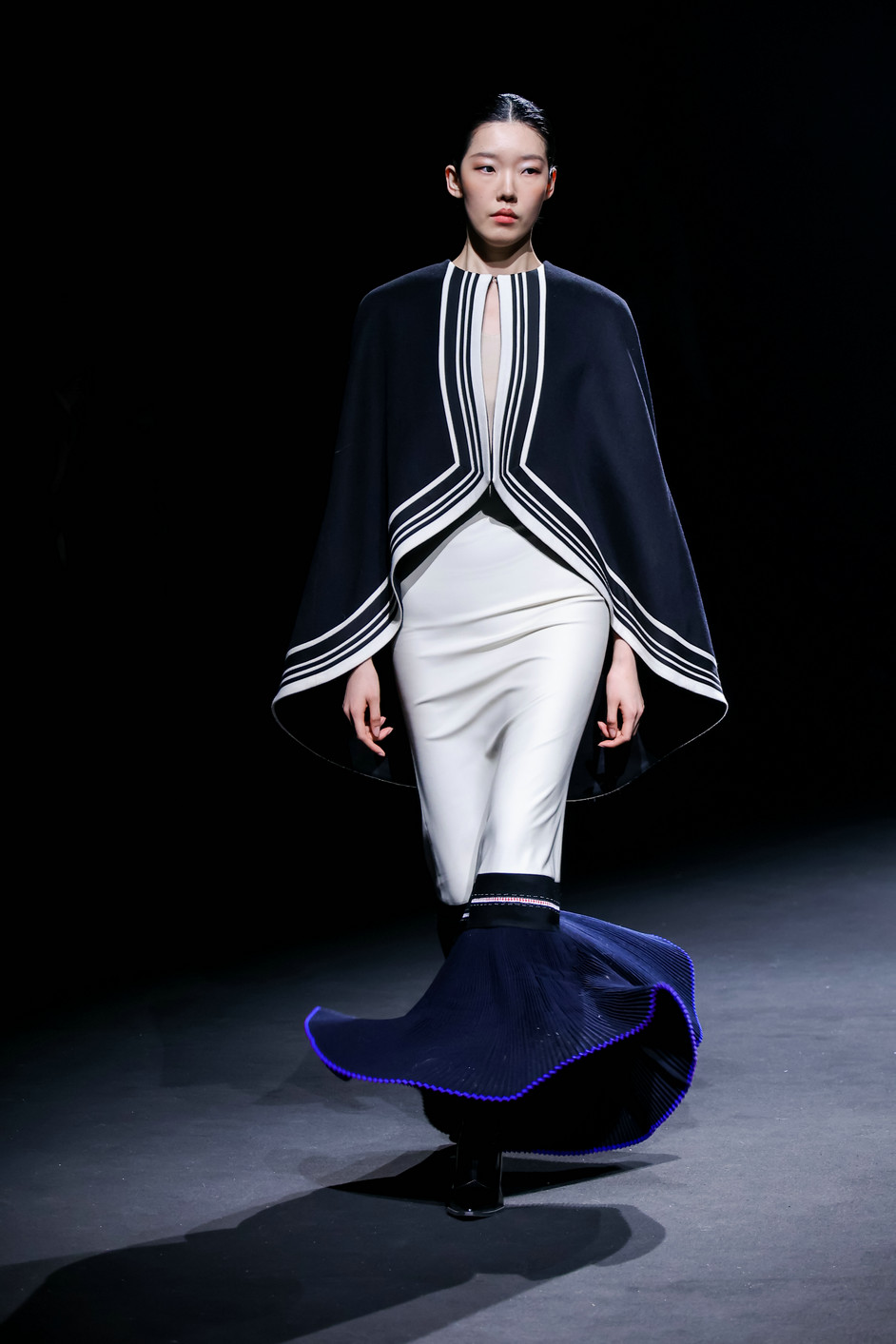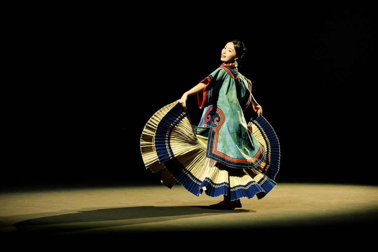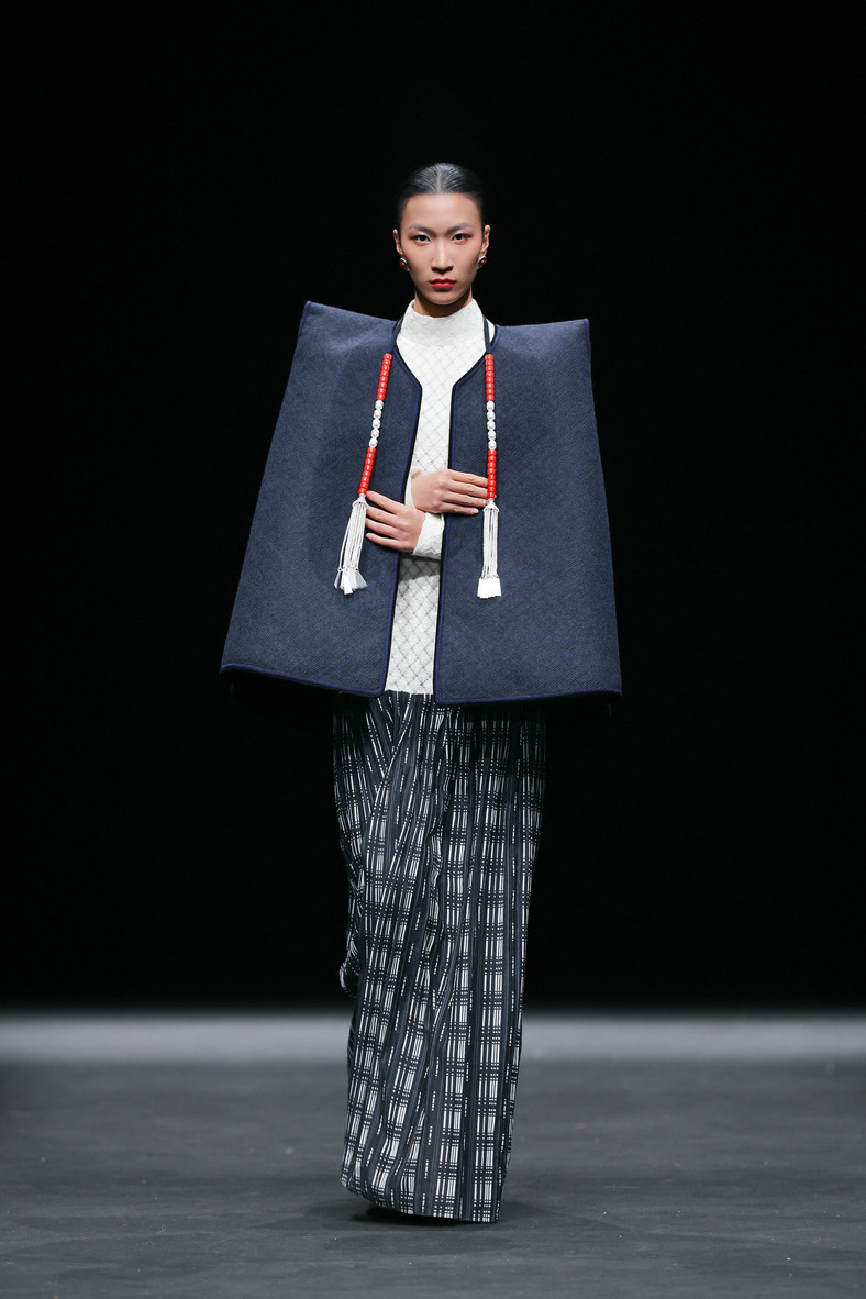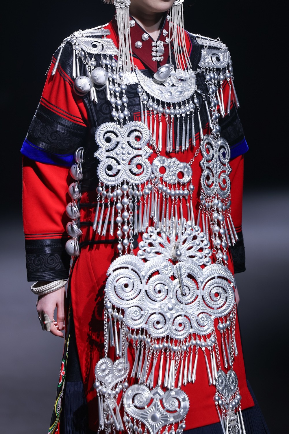 开篇“源启”极具震撼,随着“毕摩”非遗传承人以低沉雄厚的声音吟诵着对山河无恙、生活美好的祈愿,大秀缓缓拉开序幕。北京电影学院的17位舞者在女孩的百褶裙旋转飞扬,男孩的查尔瓦斗篷翻动跳跃中,再现了彝族人民劳作、节庆、嫁娶的生活场景;随后,国家级非遗传承人贾巴子则带领彝绣、银饰、音乐等国家级、州级非遗传承人和北京服装学院、北京电影学院的表演团队共同演绎了从上世纪初到当下的共约30套传统服装,复现了彝人于山河间的生活图景。“源启”以山河为序,唤醒彝人于山河间生生不息的文明图景,让千年衣脉,自大地深处缓缓归序。