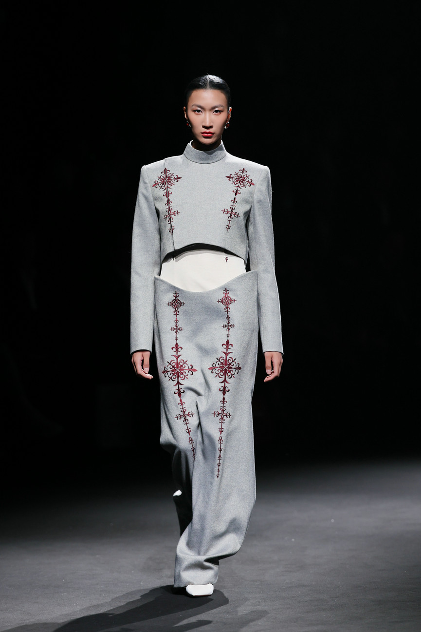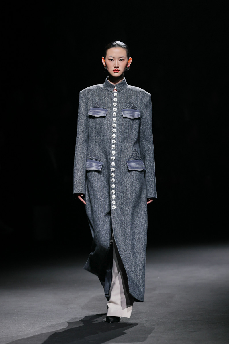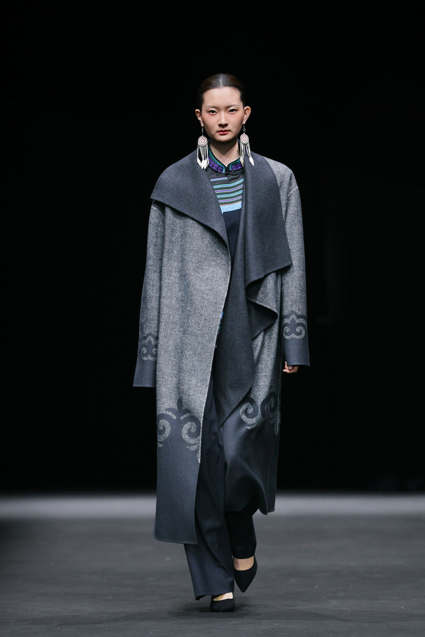 第三篇章“新生”则以近四十套大地色系的创新服饰,将传统纹样与现代面料交织成新的叙事语言——棕色承载泥土之厚重,米色示以稻麦的温润,灰色藏山石之沉静。马齿纹、火焰纹等被提炼为当代图形语言;粗精纺羊毛花呢、醋酸等面料碰撞激光切割、贴布绣、叠布绣、手工编织、压褶……,既溯源族群记忆,亦重塑当代时尚语境。在创新服装展示篇章,设计师还联合凉山州南红玛瑙品牌“小邓世家”共同打造的银饰与玛瑙首饰成为服饰搭配的亮点。本篇章的整体造型既呼应了古老的民族信仰,也是对彝族美学在当代语境中发出的既古老、又崭新的震撼回响。