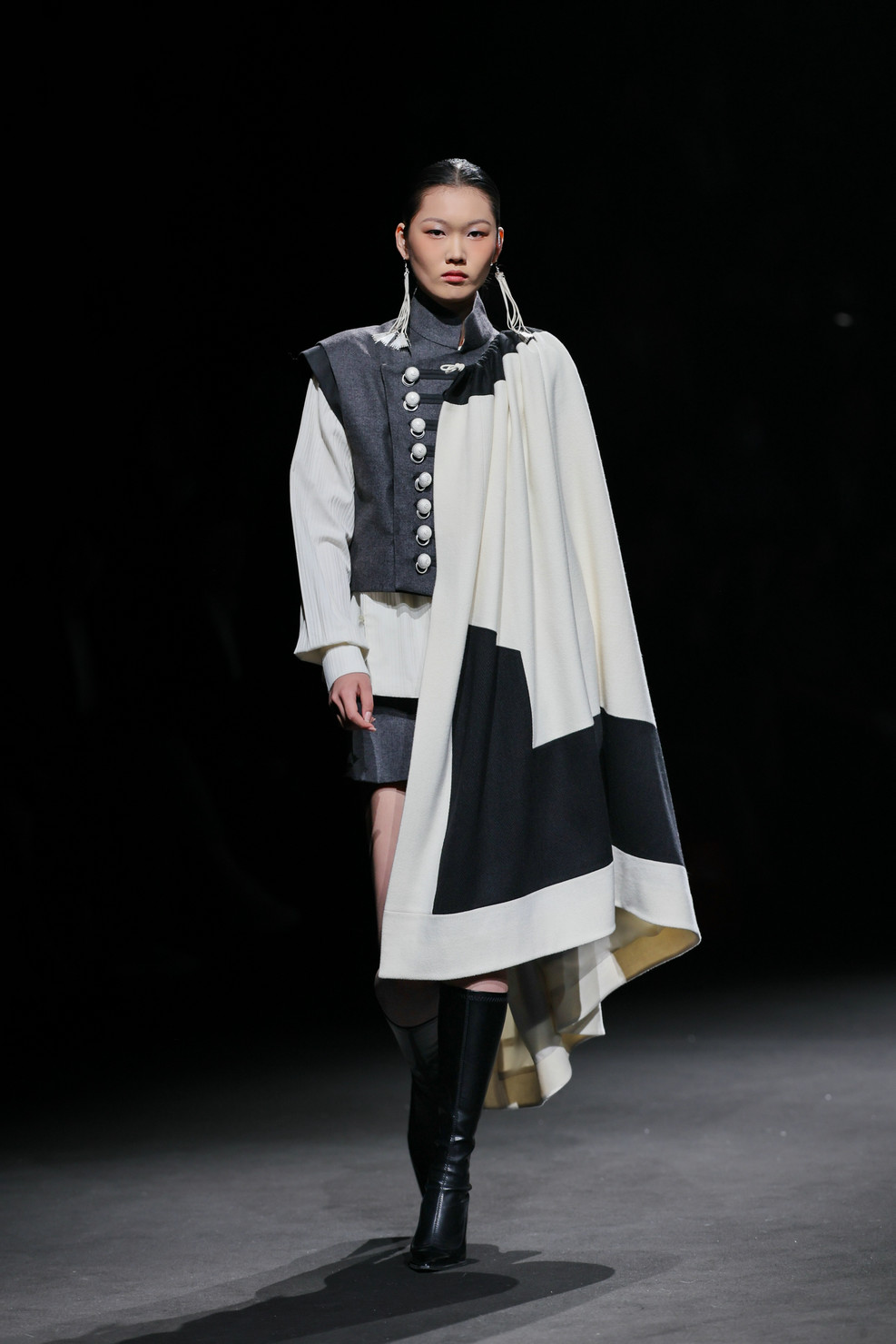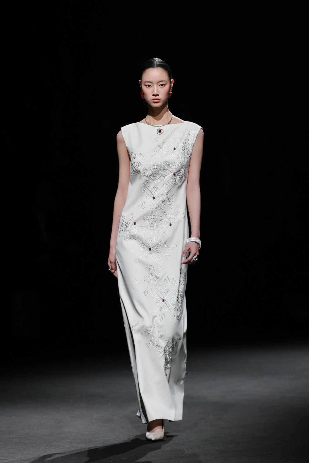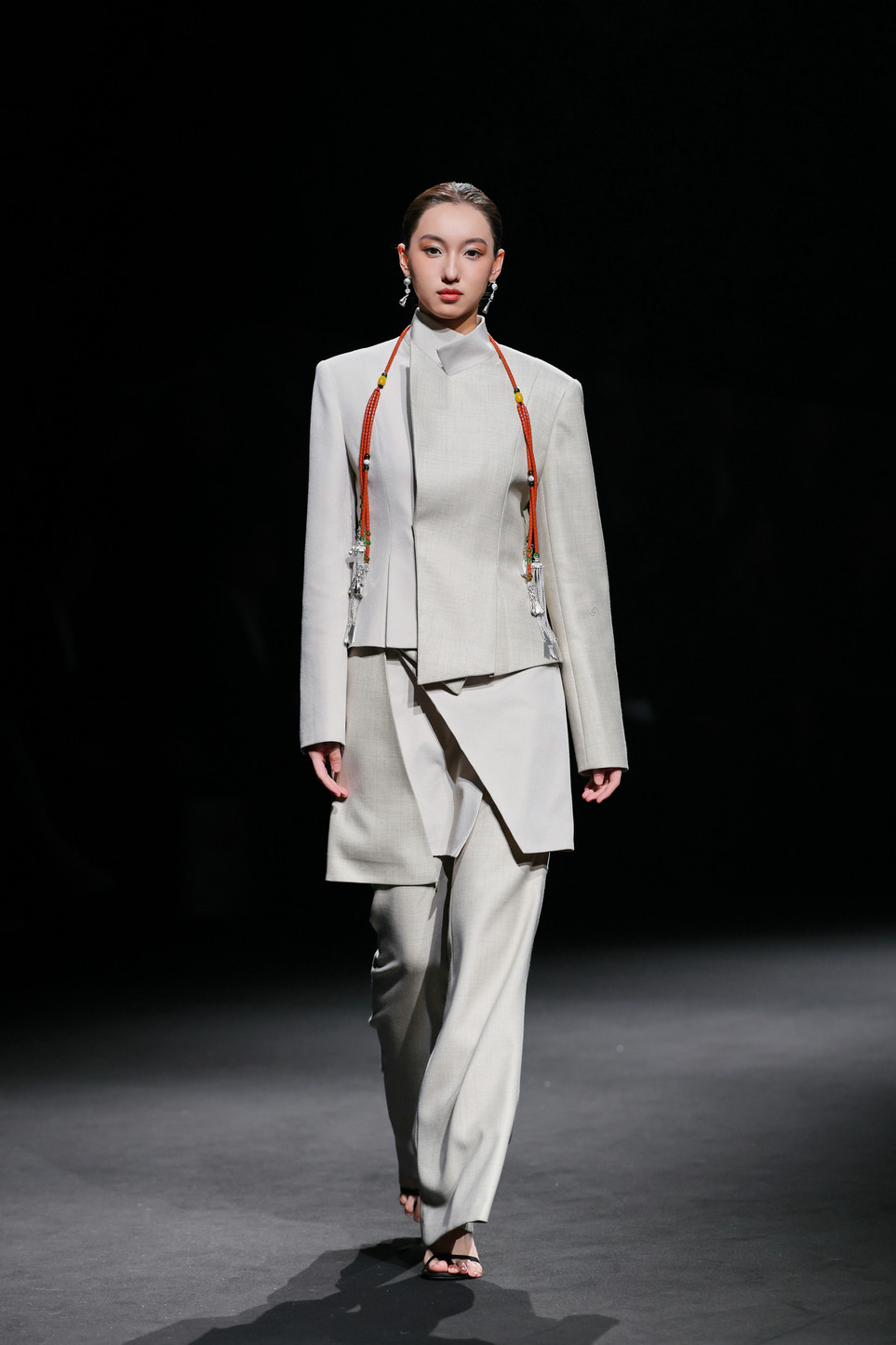 第三篇章“新生”则以近四十套大地色系的创新服饰,将传统纹样与现代面料交织成新的叙事语言——棕色承载泥土之厚重,米色示以稻麦的温润,灰色藏山石之沉静。马齿纹、火焰纹等被提炼为当代图形语言;粗精纺羊毛花呢、醋酸等面料碰撞激光切割、贴布绣、叠布绣、手工编织、压褶……,既溯源族群记忆,亦重塑当代时尚语境。在创新服装展示篇章,设计师还联合凉山州南红玛瑙品牌“小邓世家”共同打造的银饰与玛瑙首饰成为服饰搭配的亮点。本篇章的整体造型既呼应了古老的民族信仰,也是对彝族美学在当代语境中发出的既古老、又崭新的震撼回响。
