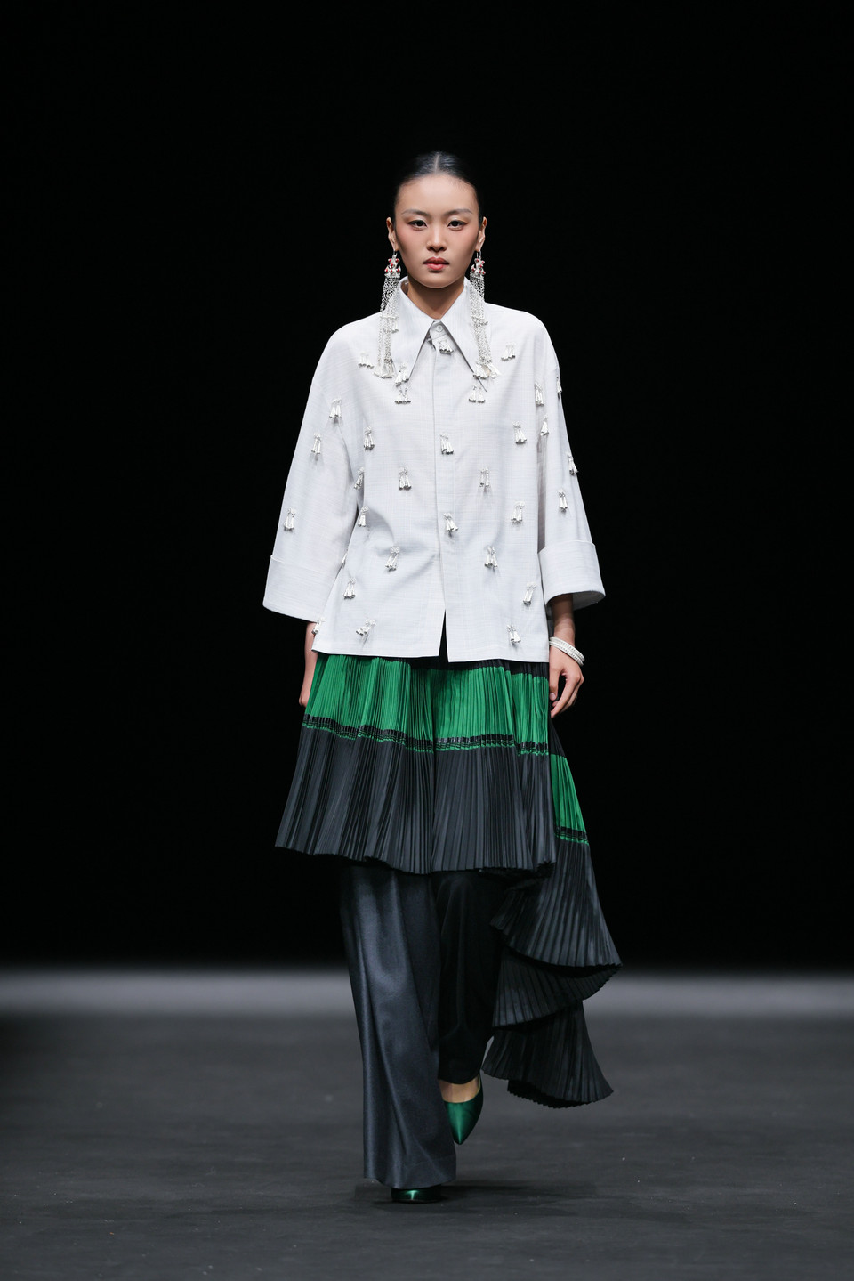 立足市场需求、当代审美与技艺传承,品牌以“非遗工坊+合作社+绣娘手工技艺+创新产品设计+设计师孵化”模式,在自我发展的同时,助力本土设计力量成长,赋能乡村振兴;同时联动非遗银饰匠人,将手工锻造的金属银扣作为点睛元素,以行走的凉山彝族美学让非遗走出博物馆,实现传统文化在当代语境下的活态传承与时尚表达。