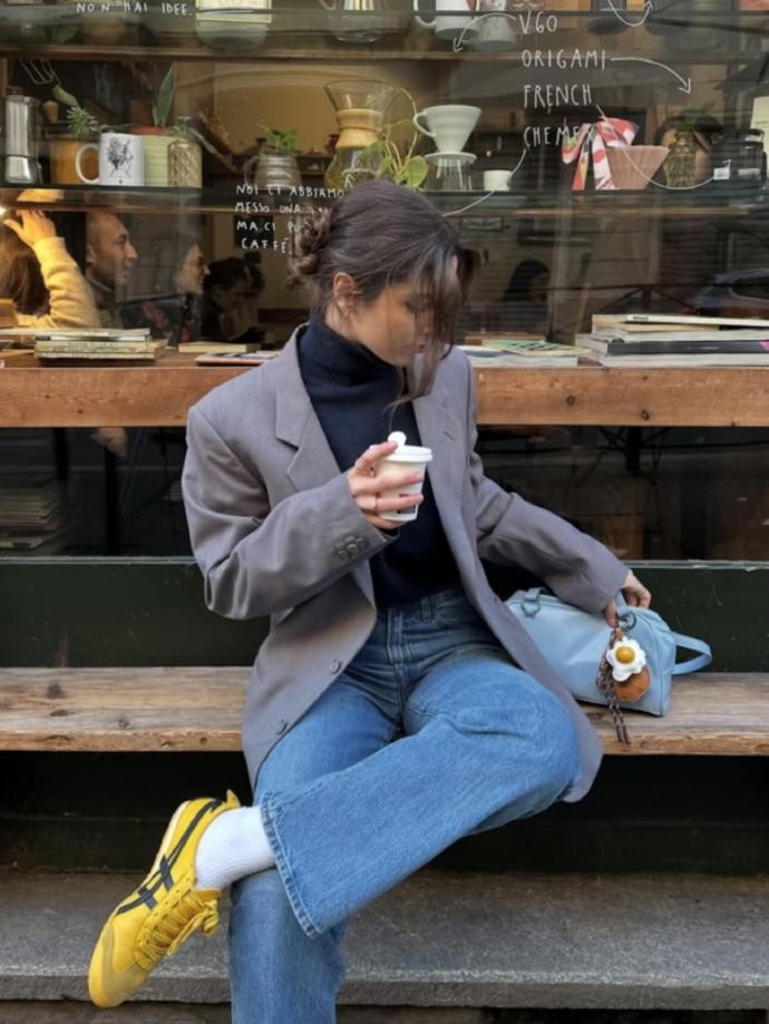 hilylucy 的穿搭之所以动人,更在于她传递出的意式生活态度 —— 时尚是生活的一部分,而非负担。她的每一套造型都与城市的烟火气相融:在咖啡馆外手持咖啡,慵懒地坐在木质台阶上,灰色西装外套搭配蓝色牛仔裤,黄色运动鞋与白色袜子增添随性;在冰淇淋店前,身着亮蓝色紧身上衣搭配牛仔裤,活力满满。这种自在舒展、不被潮流绑架的状态,让穿搭与生活完美融合。跟着 hilylucy 学穿搭,我们学到的不仅是可复制的搭配公式,更是一种享受生活、自在做自己的时尚哲学,让冬日穿搭既有温度,又有风格。