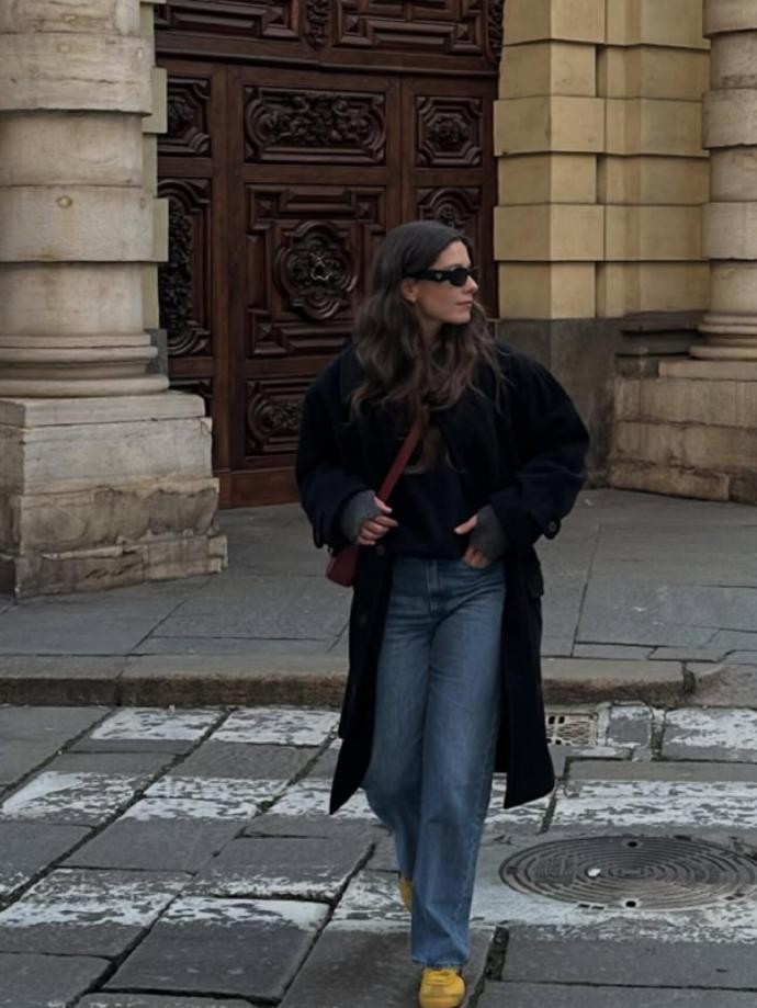 在 hilylucy 的冬日穿搭里,大地色系与低饱和色调的运用堪称教科书级别。她偏爱深棕、浅灰、米白、卡其这些沉稳的色彩,将其自由组合出无限可能:酒红色露肩毛衣搭配浅蓝牛仔裤,在秋日街道的暖光下,复古又显气色;深灰色牛仔套装,在石质建筑前利落干练,自带酷飒气场;条纹毛衣搭配卡其色长裤与酒红短靴,坐在米兰的广场上,与周围的欧式建筑融为一体,满是复古氛围感。同时,她也擅长用亮色做点缀,黄色运动鞋、红色包包,为低饱和的造型注入鲜活,让冬日穿搭摆脱沉闷。