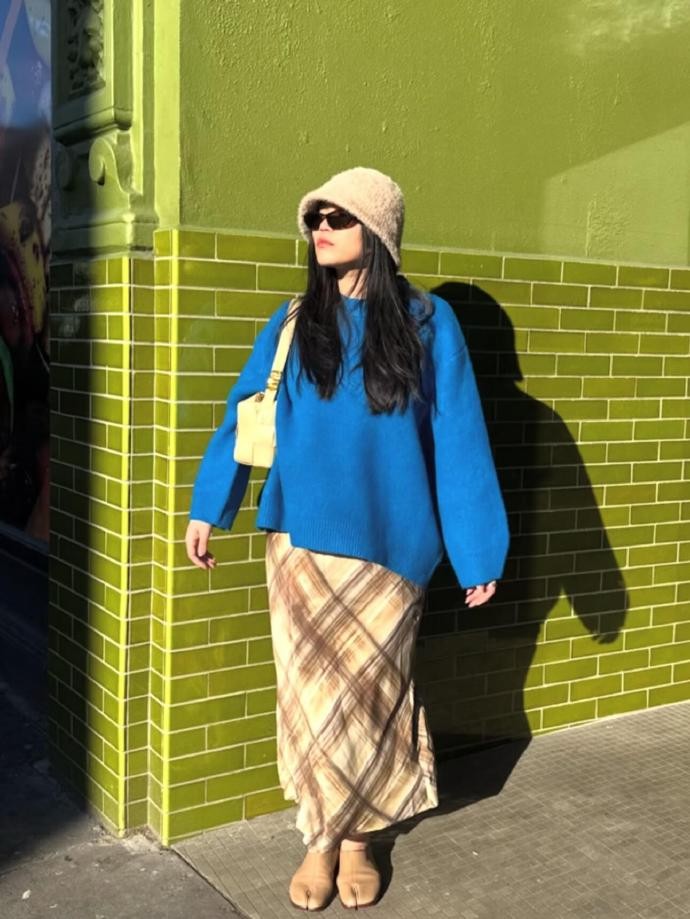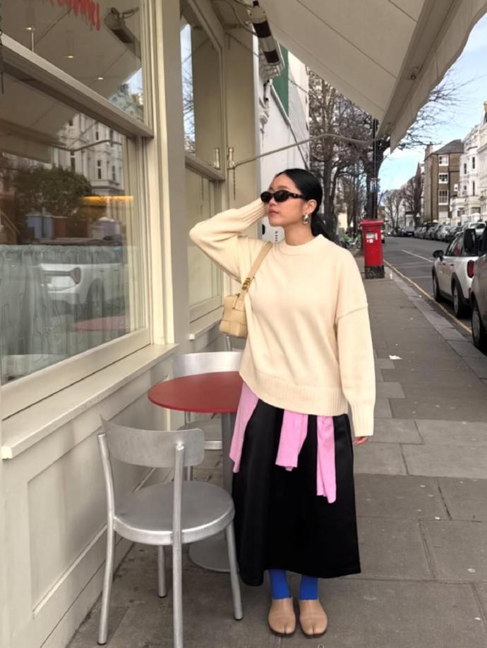 色彩是 timetymec 造型里的点睛之笔,她擅长用低饱和底色搭配明亮色块,制造视觉焦点却不显得杂乱。奶白毛衣配黑色缎面半裙时,腰间垂落的粉色布条成了整个造型的呼吸感来源;宝蓝色毛衣与格纹半裙的组合,在暖光下显得温柔又亮眼,哪怕是基础款牛仔裤,也能通过亮黄色蕾丝半裙的叠穿,瞬间跳出沉闷。这种 “小面积撞色” 的技巧,既降低了色彩驾驭的难度,又能让整体造型更有层次,非常适合想要尝试亮色却怕出错的普通人。