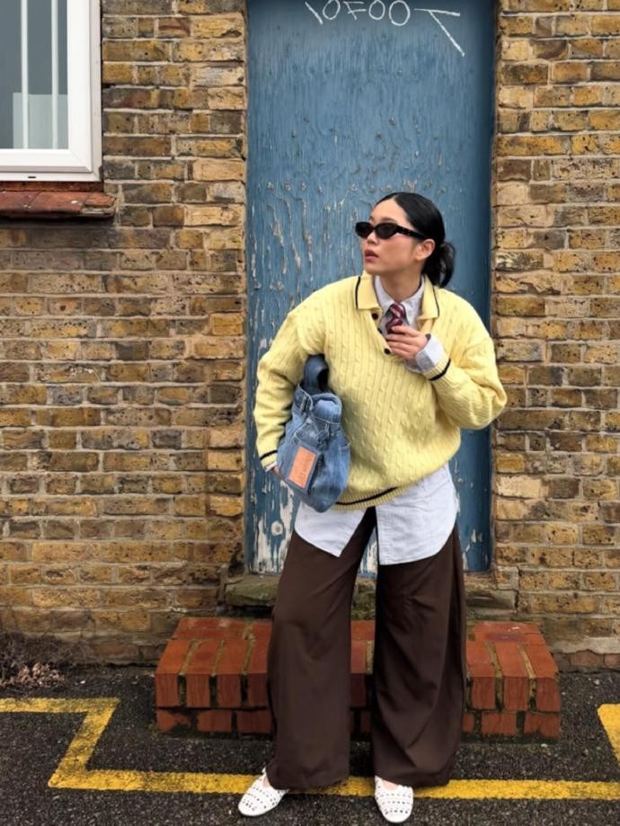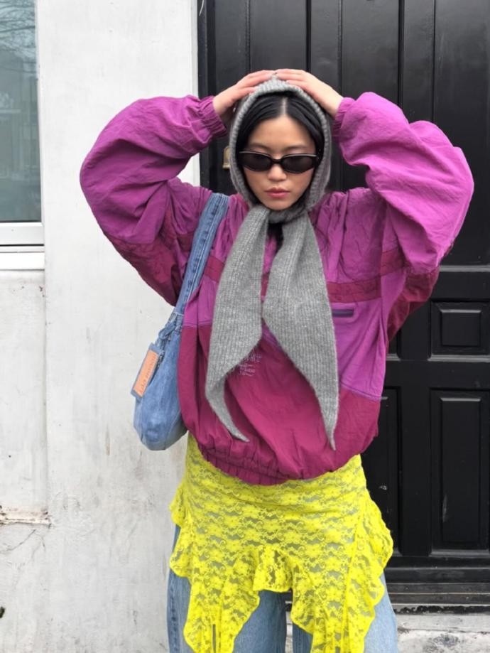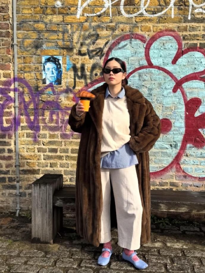 她的穿搭里藏着很多提升精致感的细节,配饰永远是画龙点睛的存在。从迷你腋下包到牛仔托特包,包款的选择总能和整体风格呼应,毛绒贝雷帽、针织连帽围巾的加入,既兼顾了保暖又强化了造型的复古氛围,就连袜子和鞋子的搭配都充满巧思 —— 蓝色中筒袜配分趾鞋,粉色袜子搭玛丽珍,这些小细节让造型更完整,也让日常穿搭多了几分趣味。她还很擅长利用叠穿制造层次感,衬衫外搭毛衣、毛衣外披大衣,或是在腰间系上一件针织衫,简单的单品瞬间就有了更多可能性。